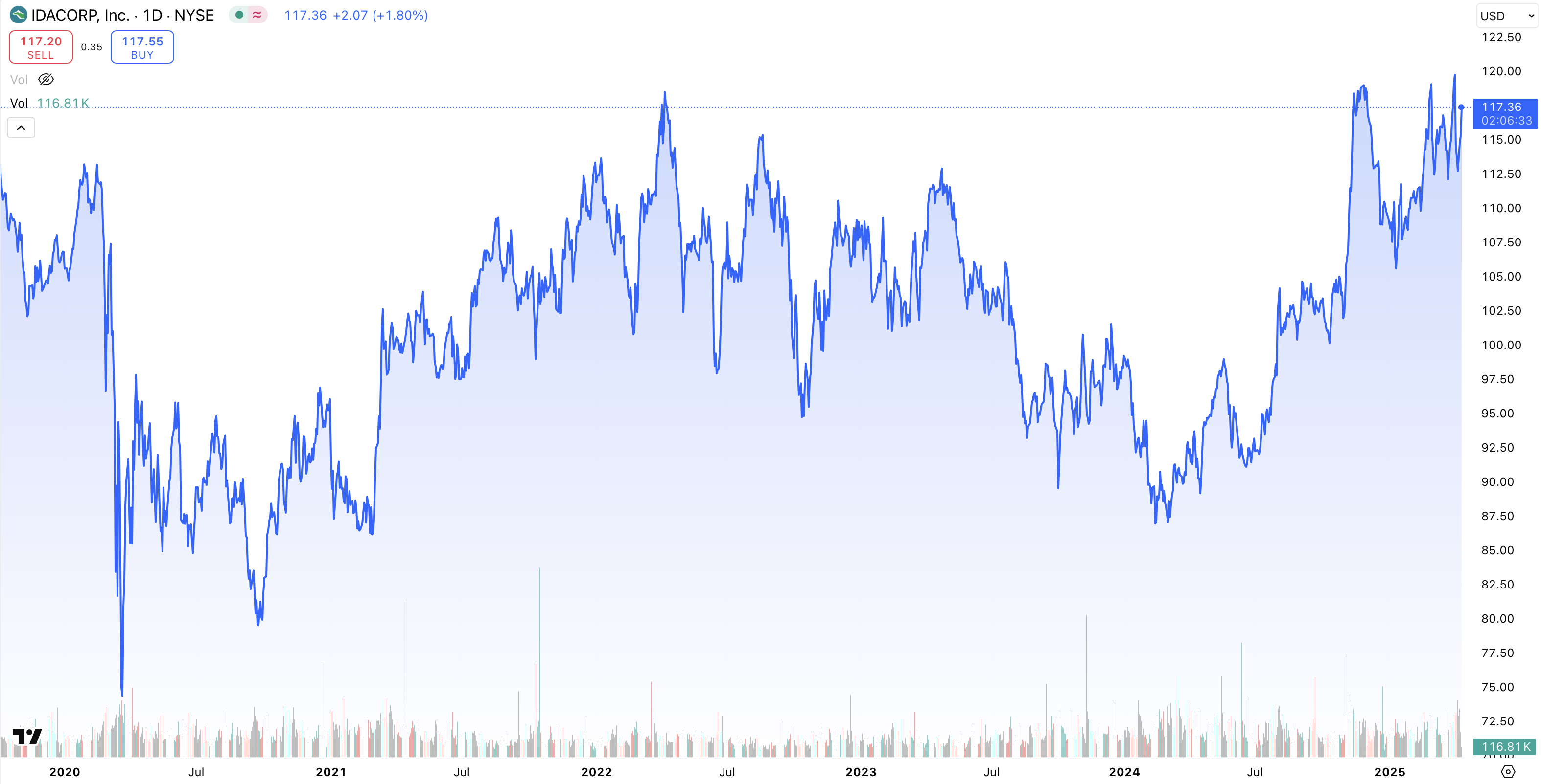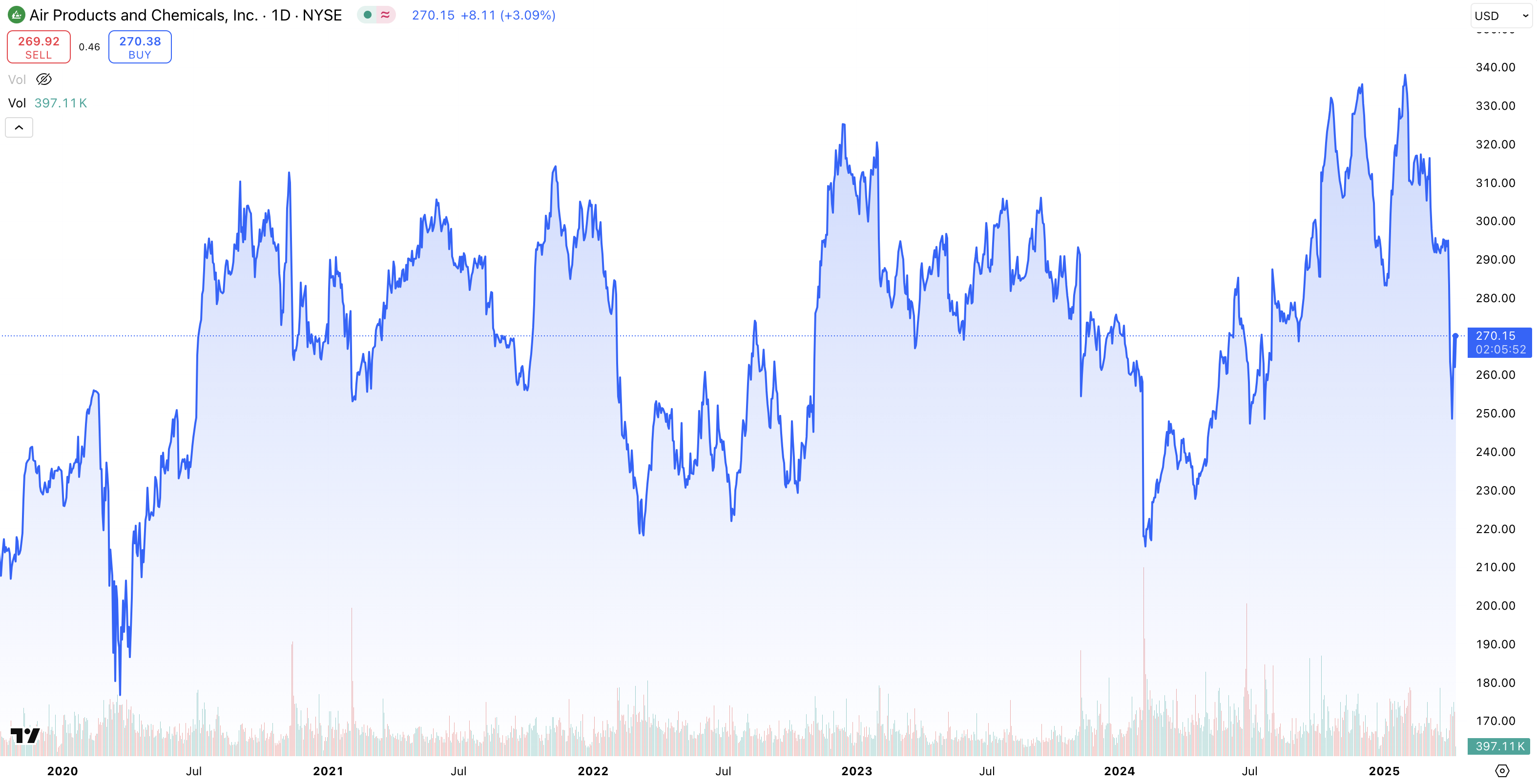 Grafen visar kursutvecklingen för bolaget mellan 2020 och 2025. Under perioden uppgick den totala avkastningen till ungefär 84 %. Det är en bra avkastning, men kan tolkas som relativt lågt i jämförelse med övriga bolag inom energisektorn.