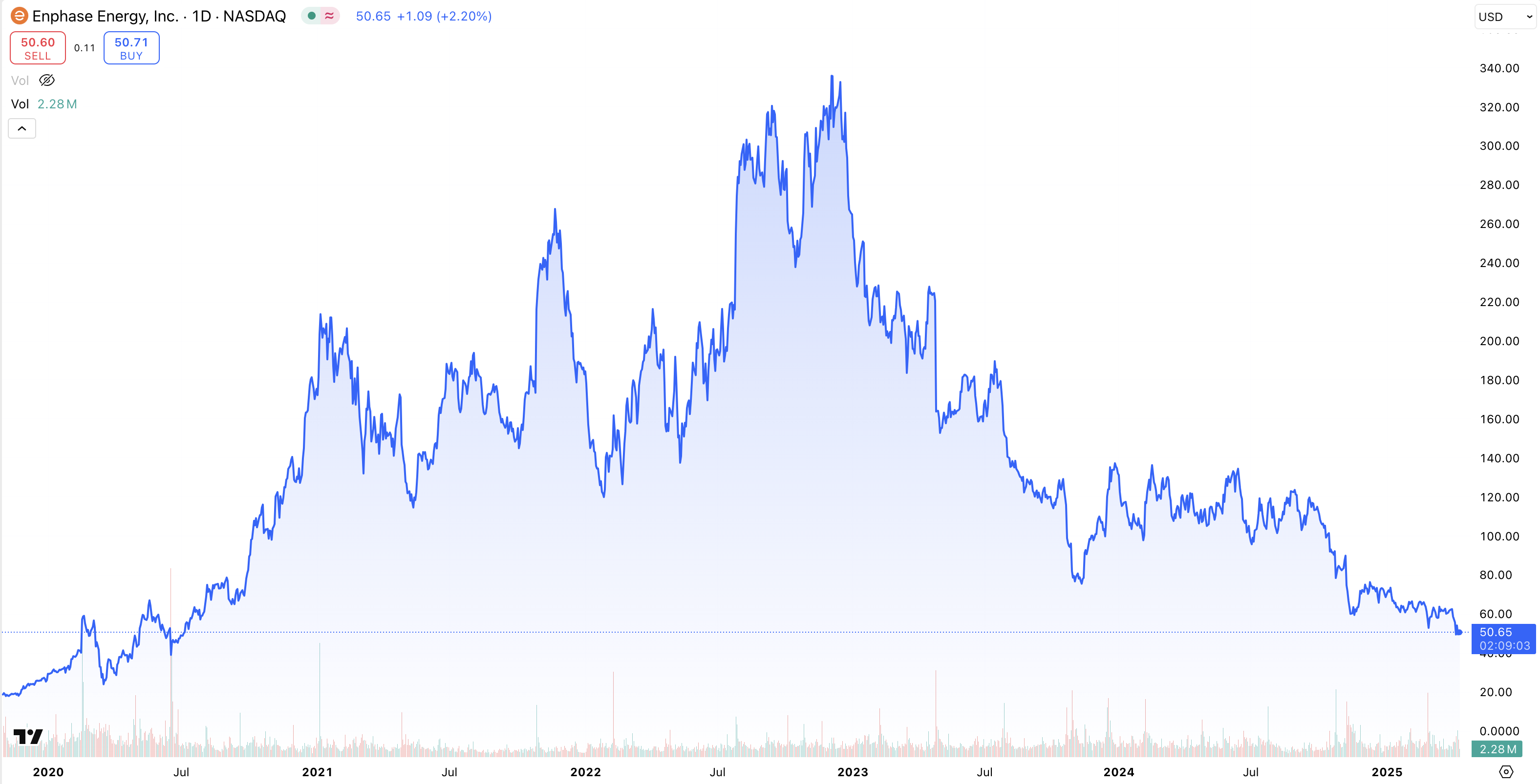 Diagrammet visar hur Enphase Energys aktiekurs utvecklats mellan 2020 och 2025. Under perioden noterade aktiekursen en ökning på 29 %. Under samma period levererade DJUS (Dow Jones U.S. index) en avkastning på ungefär 89 %.
