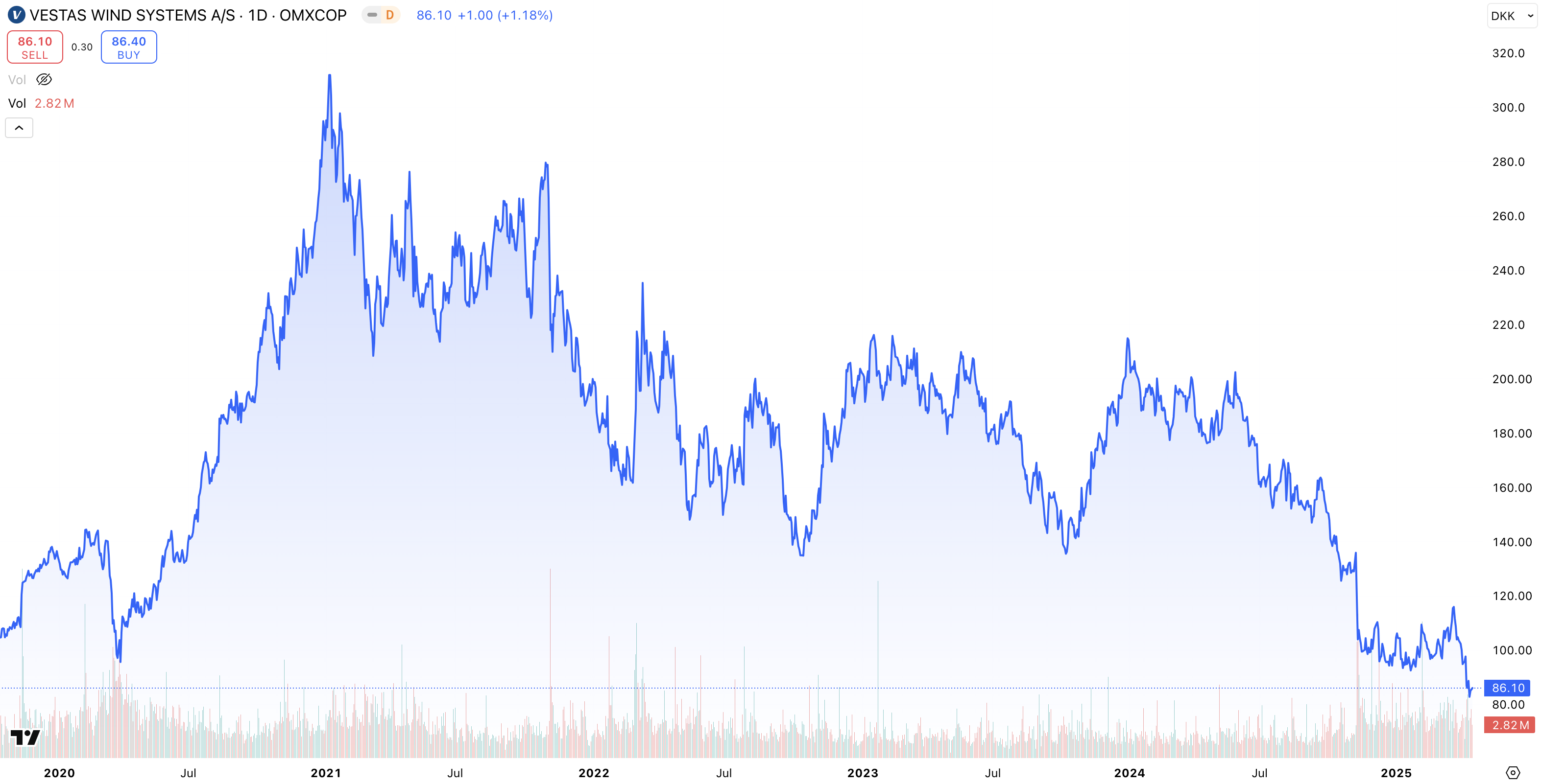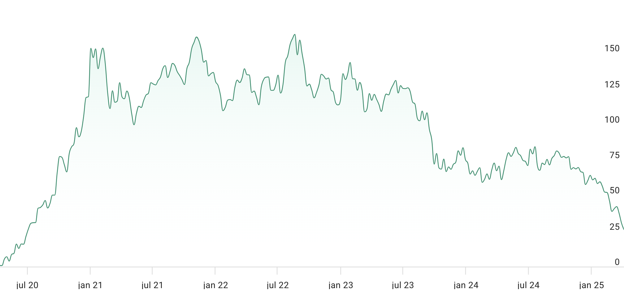 År 2024 sjönk dock vinsten kraftigt med ungefär 80 %. Det har lett till att aktiekursen sjunkit drastiskt under sista delen av perioden från grafen ovan.