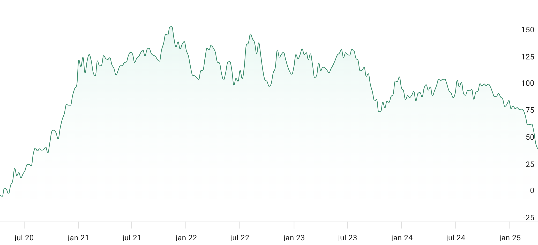 - Kursutveckling 5 år: + 29 % (2020 – 2025)