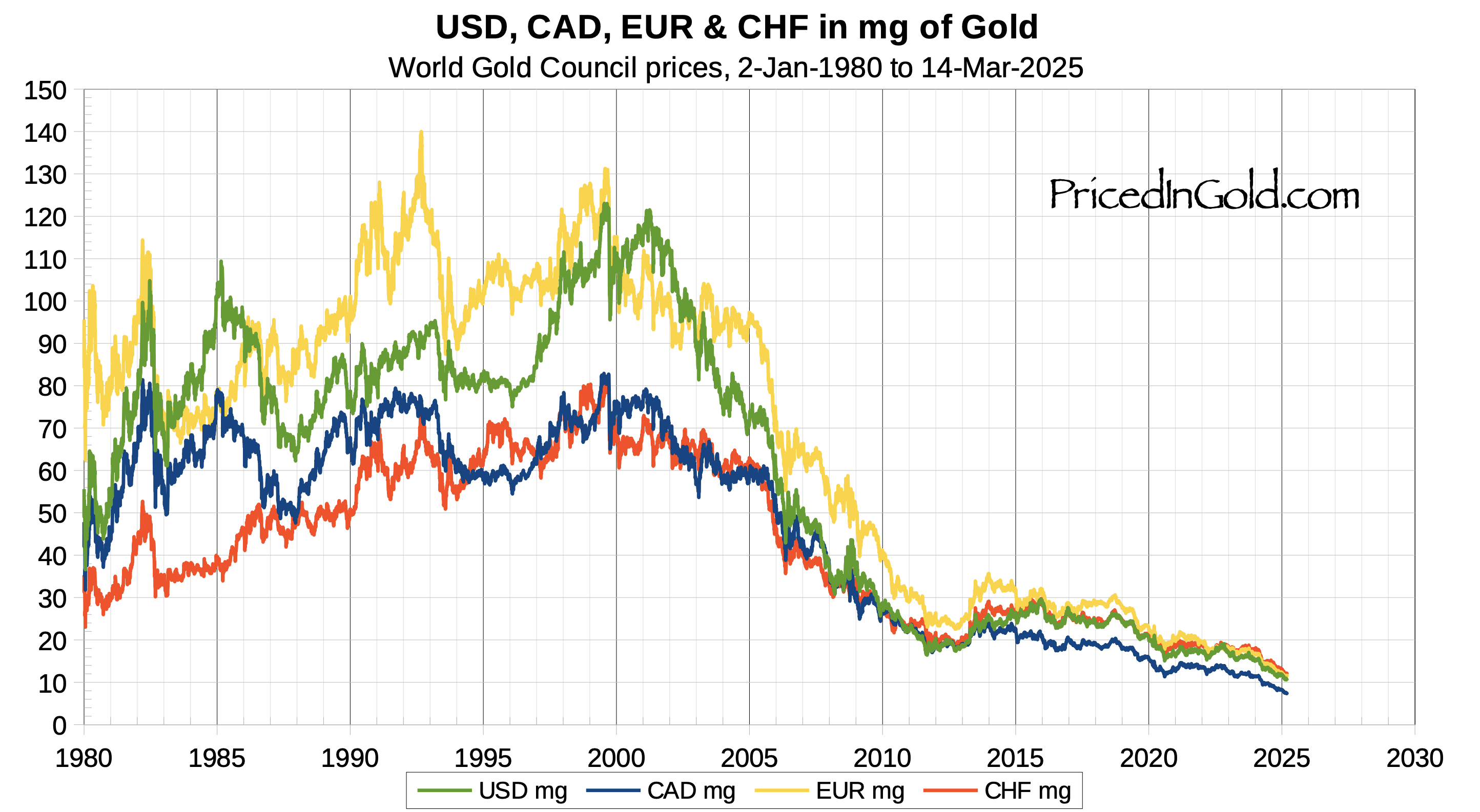 Grafen ovan visar hur amerikansk dollar (USD), kanadensisk dollar (CAD), euro (EUR) och schweizisk franc (CHF) sjunkit i värde i relation till guld per milligram. Deras värde har visat på en negativ utveckling de senaste 20 åren.