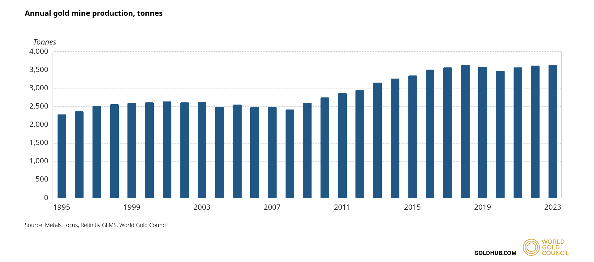 Det beror delvis på att utrustningen blir allt dyrare, samtidigt som det blir allt svårare att utvinna nytt guld. Grafen nedan visar hur mycket guld som utvunnits varje år mellan 1995 och 2023.