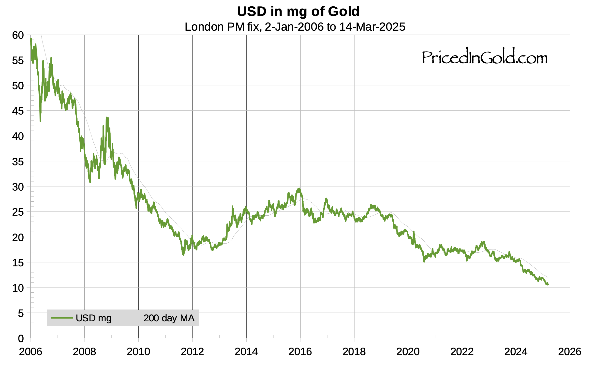Grafen nedan visar prisutvecklingen för den amerikanska dollarn mätt i milligram per guld mellan 2006 – 2025.