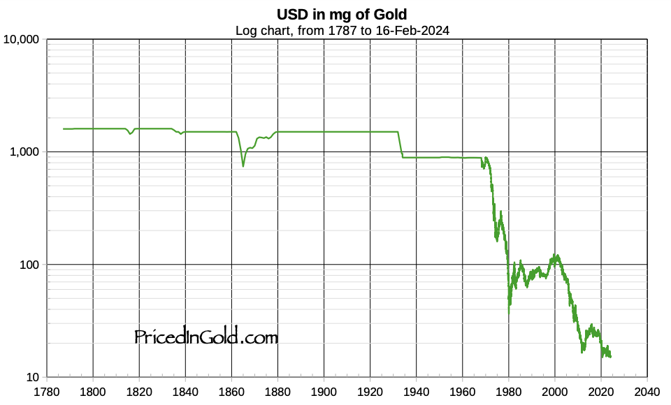 Grafen nedan visar prisutvecklingen för den amerikanska dollarn mätt i milligram per guld mellan 1787 – 2025.
