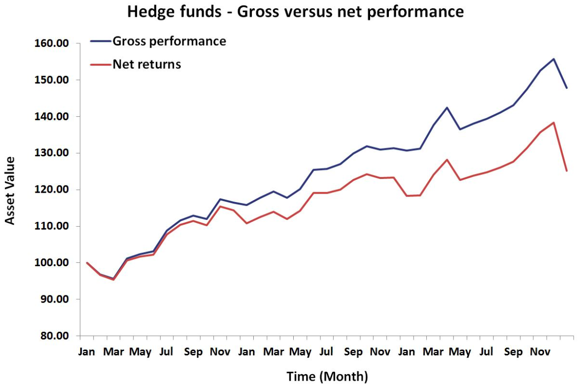 Bilden nedan visar en hedgefonds brutto- och nettoresultat efter avgifter.