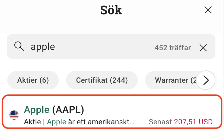 Har du pengar på ditt konto? Då klickar vi på sökknappen, söker och väljer i detta exempel efter Apple (AAPL).