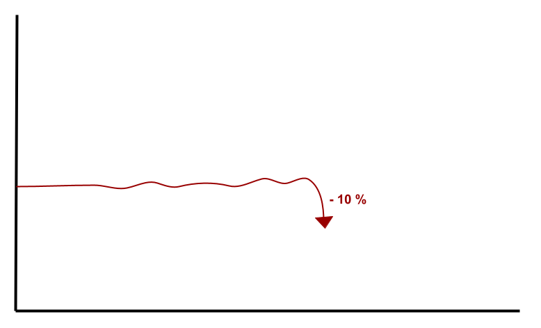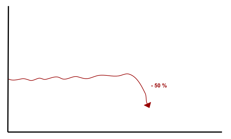 Exempel: Föreställ dig nu samma aktieportfölj A som innan. Istället för att en av aktierna skulle öka i värde med 100 % föreställer vi oss nu ett scenario där en av aktierna faller med 100 %, efter att bolaget gått i konkurs. Din avkastning på din totala portfölj kommer då att bli minus 50 %.