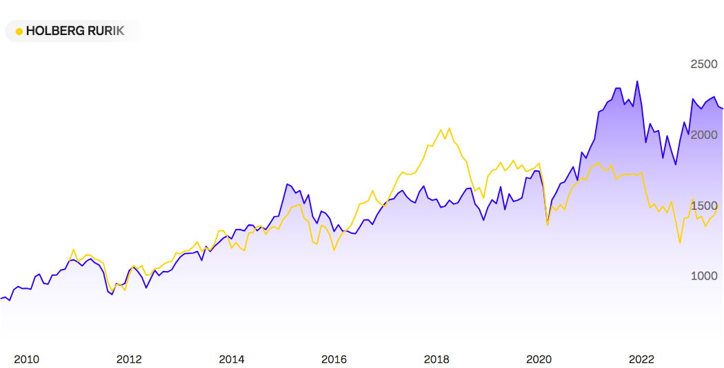 Bilden nedan jämför OMXS30-index (blå) med Holberg Rurik A (gul), vilket är en aktiv förvaltad fond. Sedan 2010 går det att se hur index presterat bättre än den aktivt förvaltade fonden.