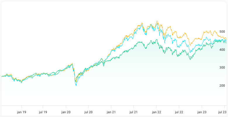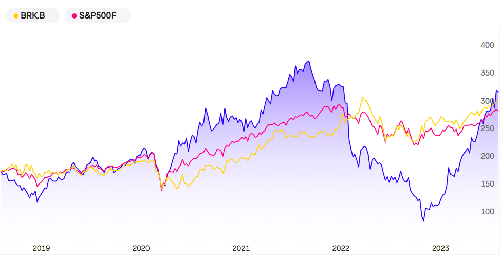 I grafen nedan jämförs Meta Platforms (blå), Berkshire Hathaway (gul) och S&P 500 index (röd). Berkshire Hathaway, som är ett investmentbolag och därför exponerar sig mot flera olika företag, har visat på en jämlik avkastning med S&P 500 index. Meta ligger betydligt längre ifrån index.