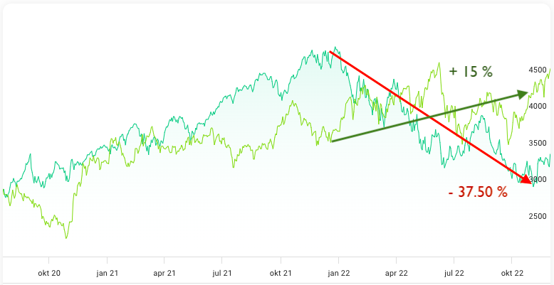 För att visa hur diversifiering av bransch kan göra stor skillnad för din avkastning ska vi gå igenom ett exempel. Bilden nedan visar utvecklingen för två branschindex.