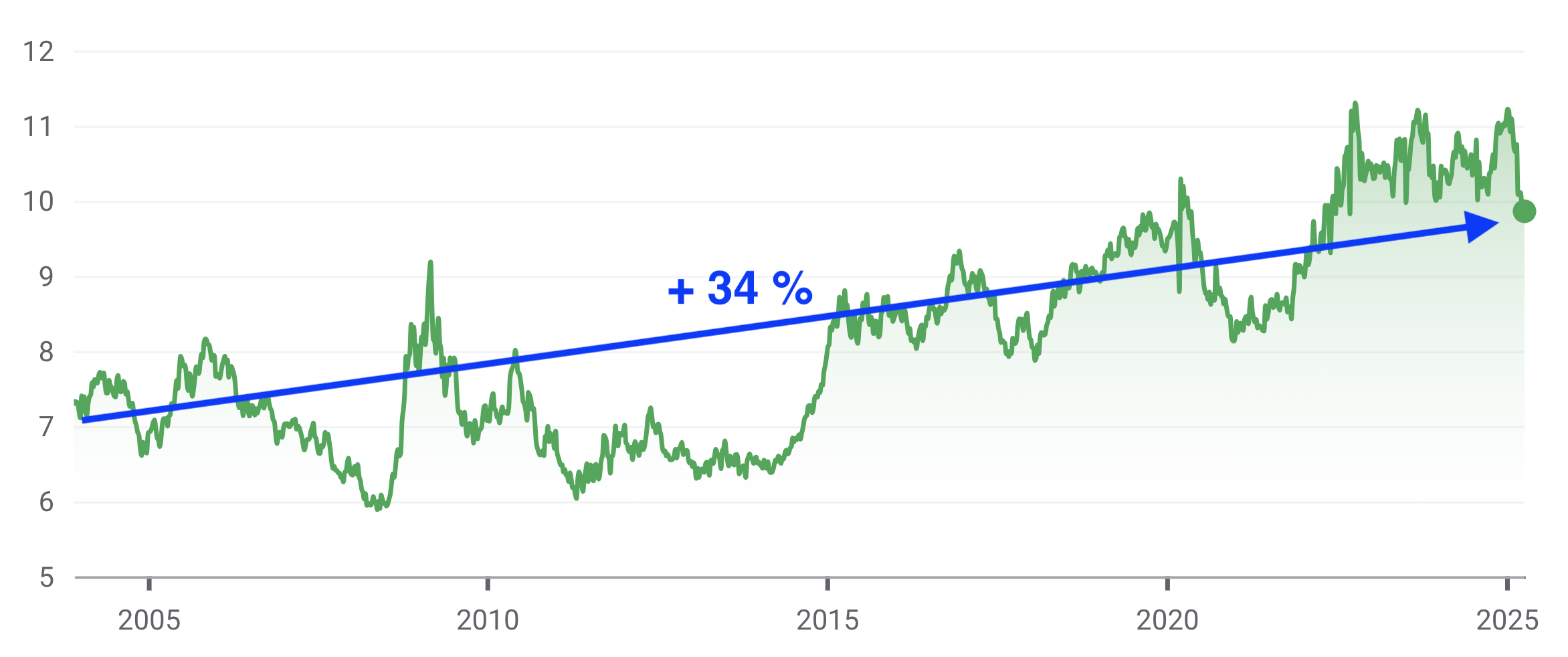 Valutan kan också stiga mot den svenska valutan. Då kan en investering i en amerikansk aktie som inte rört sig alls ändå leda till en positiv avkastning. Bilden nedan visar hur exempelvis dollarn stigit mot den svenska kronan med ungefär 34 % mellan 2015 och 2025.