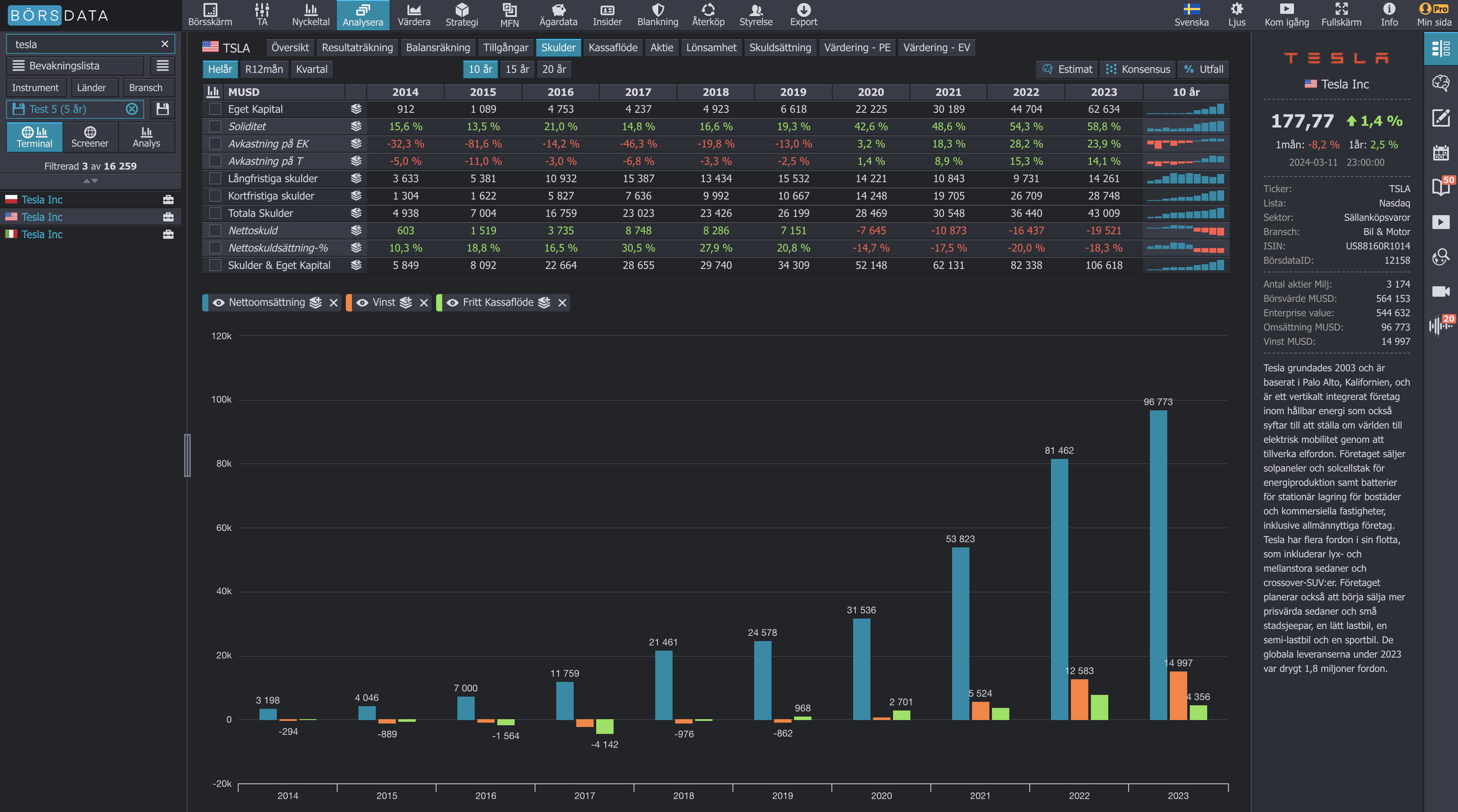 Skärmdumpen nedan är tagen från Börsdata och visar startsidan för Tesla (TSLA). Den ger en god översikt över Teslas finansiella resultat över en 10-årsperiod. Det går bland annat att se hur deras omsättning, vinst och kassaflöde växt med tiden i stadig takt.