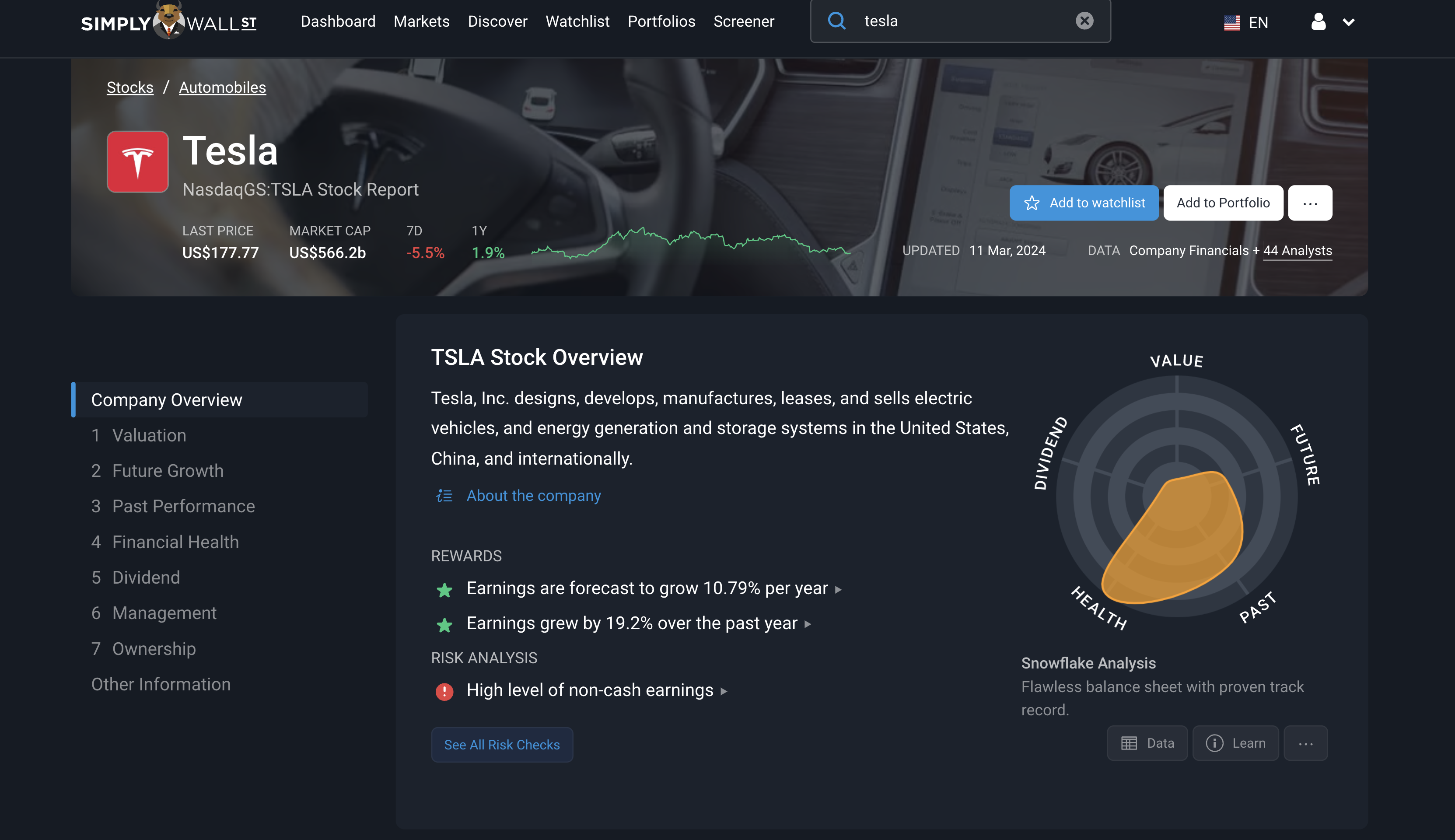 Nedan visas en skärmdump från Simply Wall St. Vi har i exemplet nedan valt att visa företagssidan för Tesla. Till vänster finns en innehållsförteckning med mycket bolagsinformation om bolaget vad gäller omsättning, vinst, värdering, konkurrenter, nyckeltal och mycket mer.