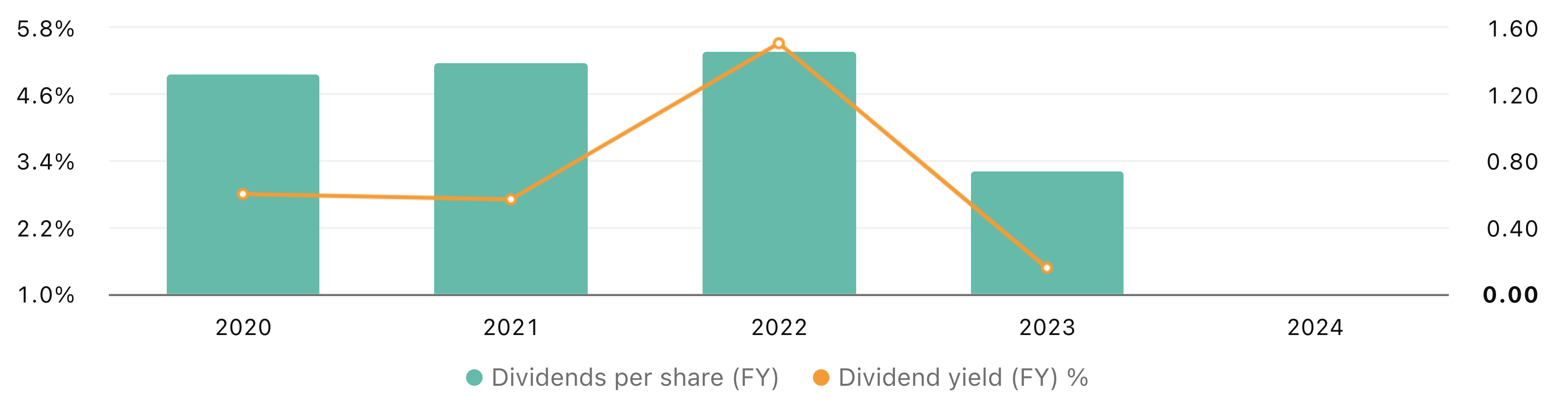 Utdelningen låg stabilt på en hög nivå mellan 2020 och 2022, men sänktes kraftigt för räkenskapsåret 2023. Direktavkastningen ökade år 2022, vilket kan bero på fallande aktiekurs, men föll sedan brant 2023. Diagrammet visar tydligt att Intel minskat sin utdelning i takt med vikande resultat och ökade investeringar.
