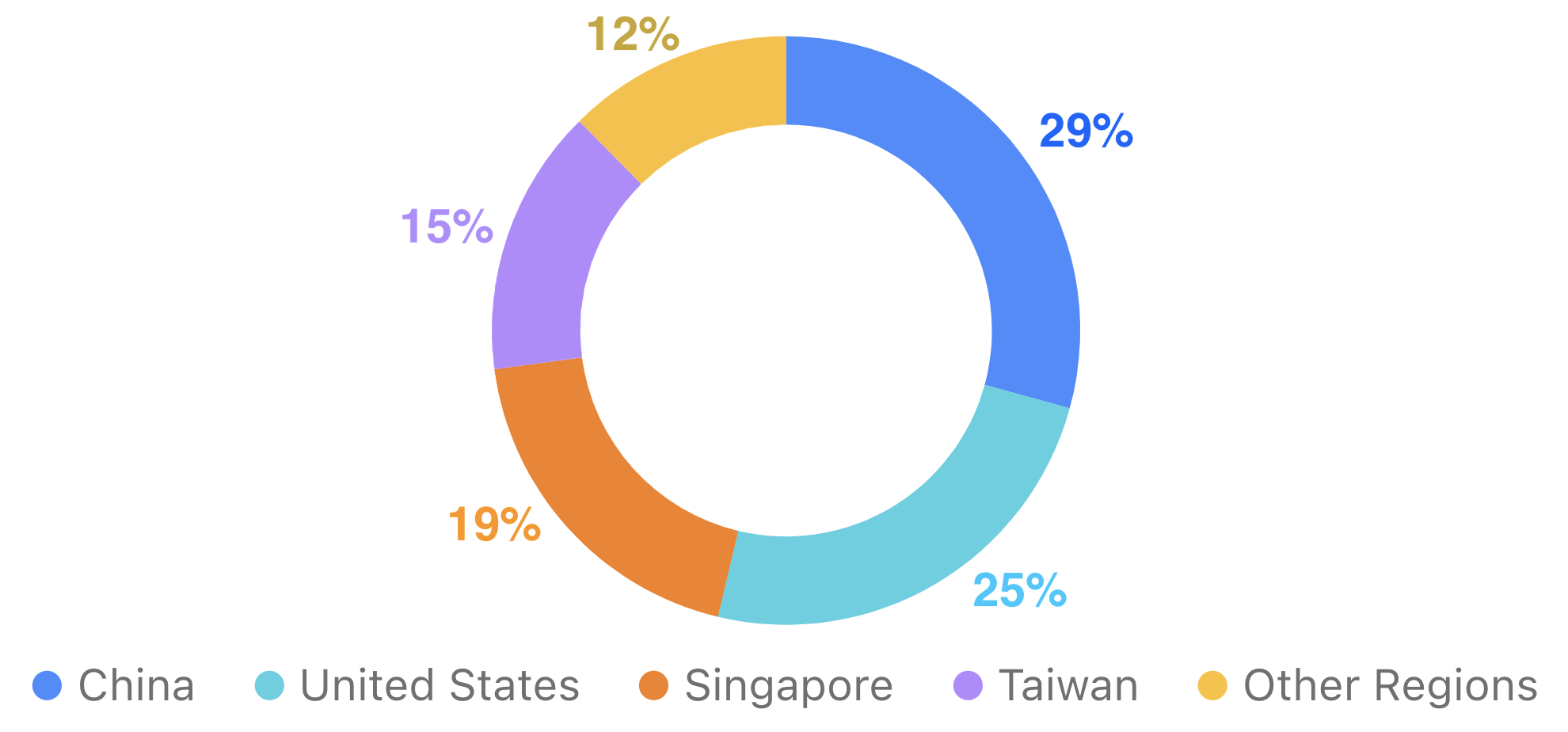Cirkeldiagrammet ovan visar hur Intels omsättning är fördelad mellan olika geografiska regioner. Kina står för största andelen med 29 %, följt av USA med 25 %. Singapore bidrar också med en hög andel på 19 %, medan Taiwan står för 15 %.