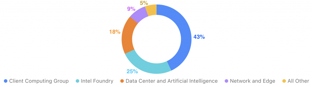 Cirkeldiagrammet ovan visar hur Intels omsättning är uppdelad mellan fem affärsområden. Störst är “Client Computing Group” (43 %), som står för nästan halva försäljningen och inkluderar chip till datorer. Näst störst är “Intel Foundry” (25 %), som tillverkar chip åt andra företag.