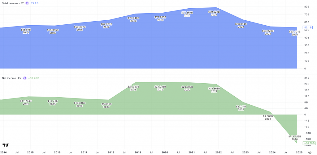 Diagrammet ovan visar hur Intels omsättning (blå) och vinst (grön) utvecklats mellan 2014 och 2024. Intäkterna växte stabilt fram till 2021 men har sedan minskat kraftigt. Vinsten nådde sin topp 2018 – 2021 men har därefter sjunkit, med en stor förlust 2024.