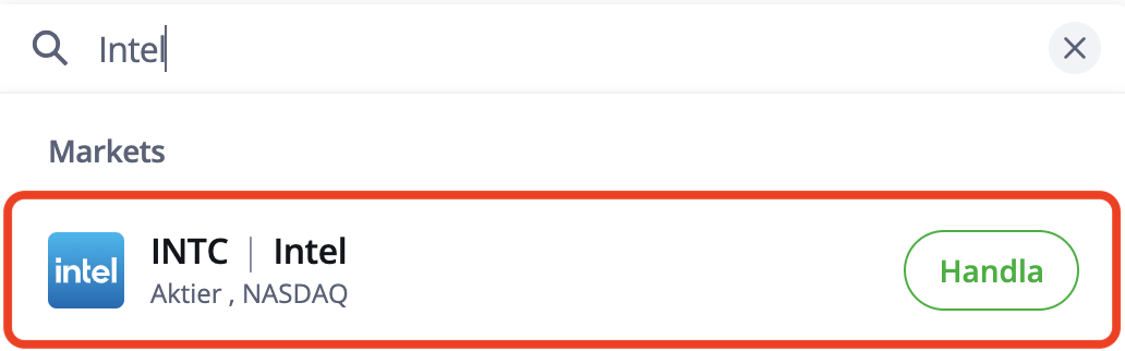 Har du pengar på ditt konto? Då klickar vi på sökknappen, söker efter Intel aktie.
