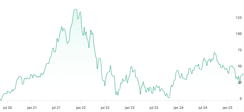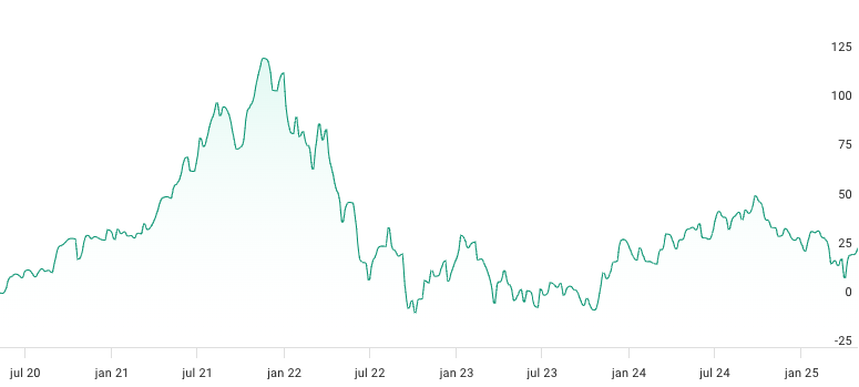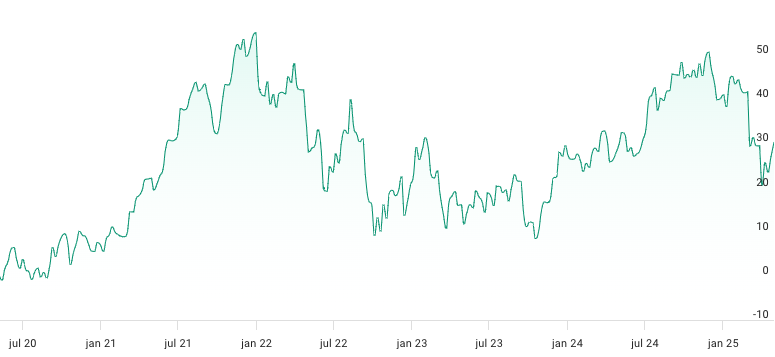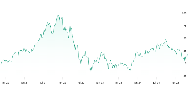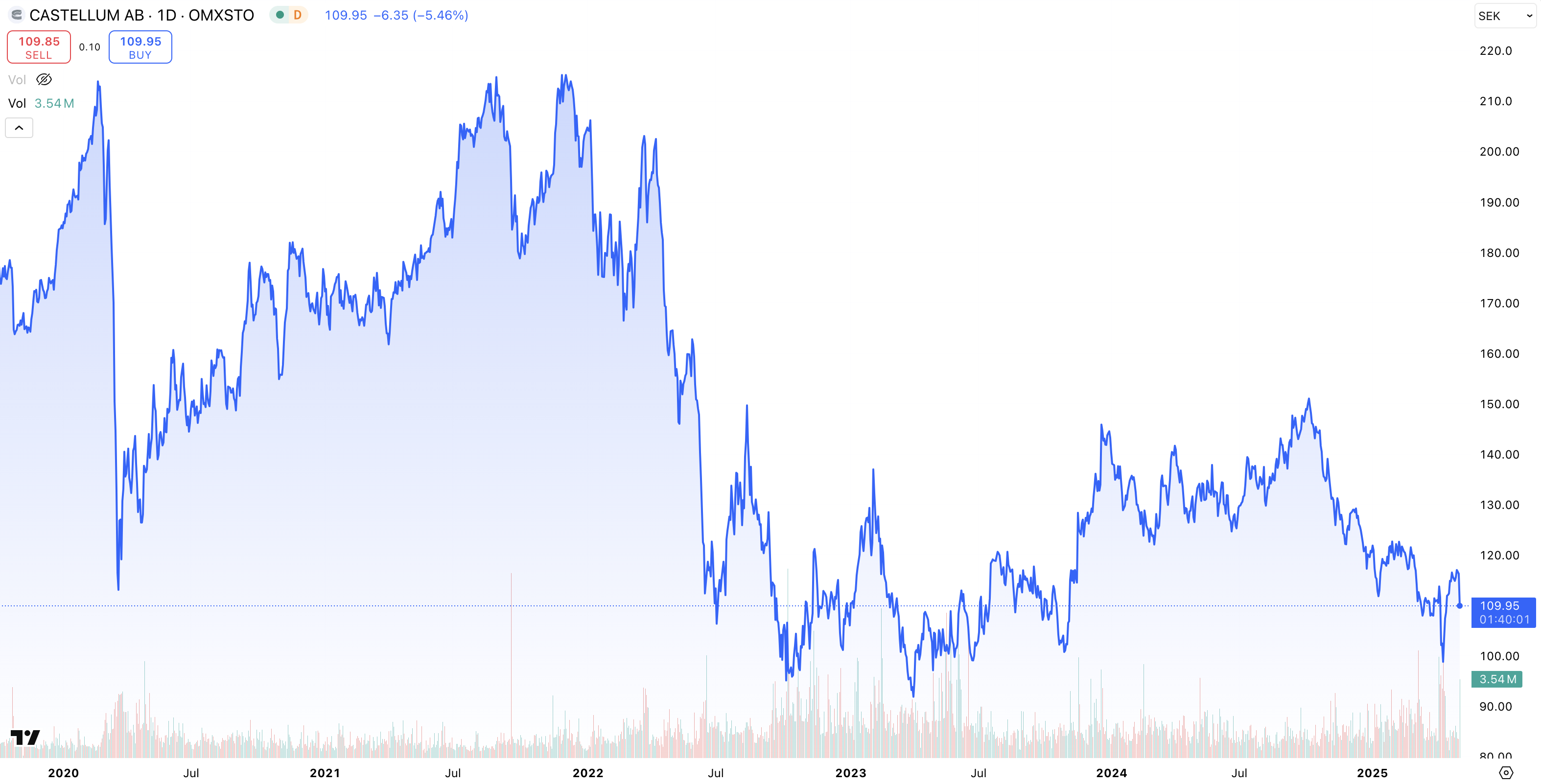 • Kursutveckling 5 år: + 104 % (2020 – 2025)