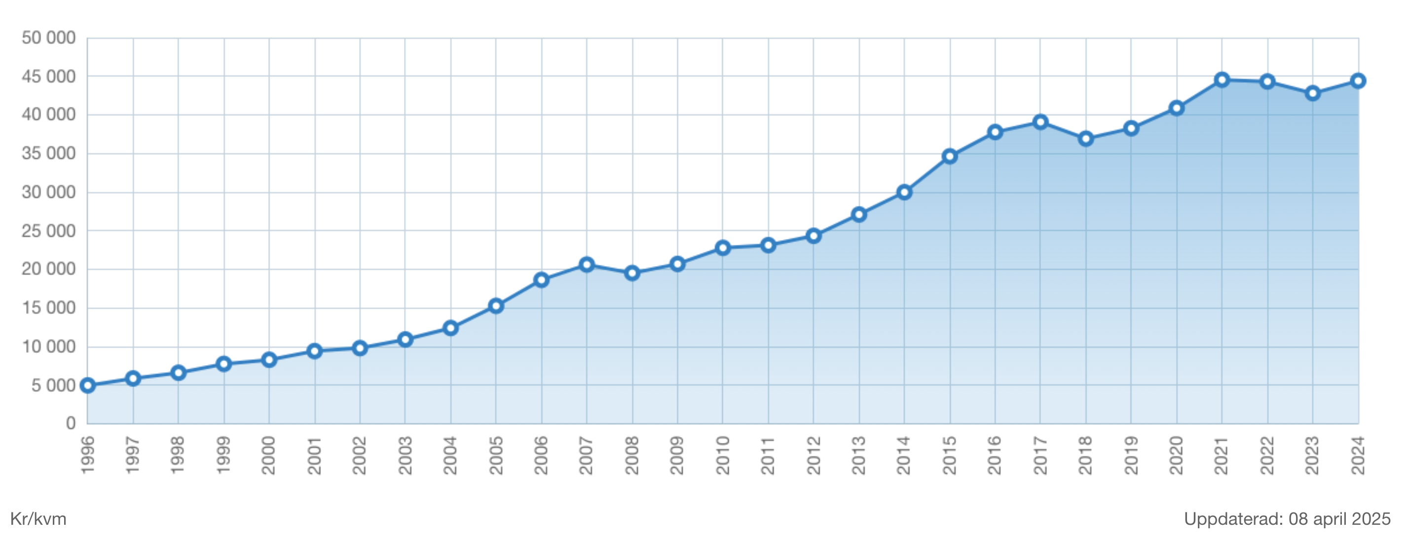 Ja, att äga fastigheter har över tid visat sig vara en mycket lönsam investering. Mellan år 1996 och 2024 har svenska bostadspriser ökar med cirka 8 % årligen.