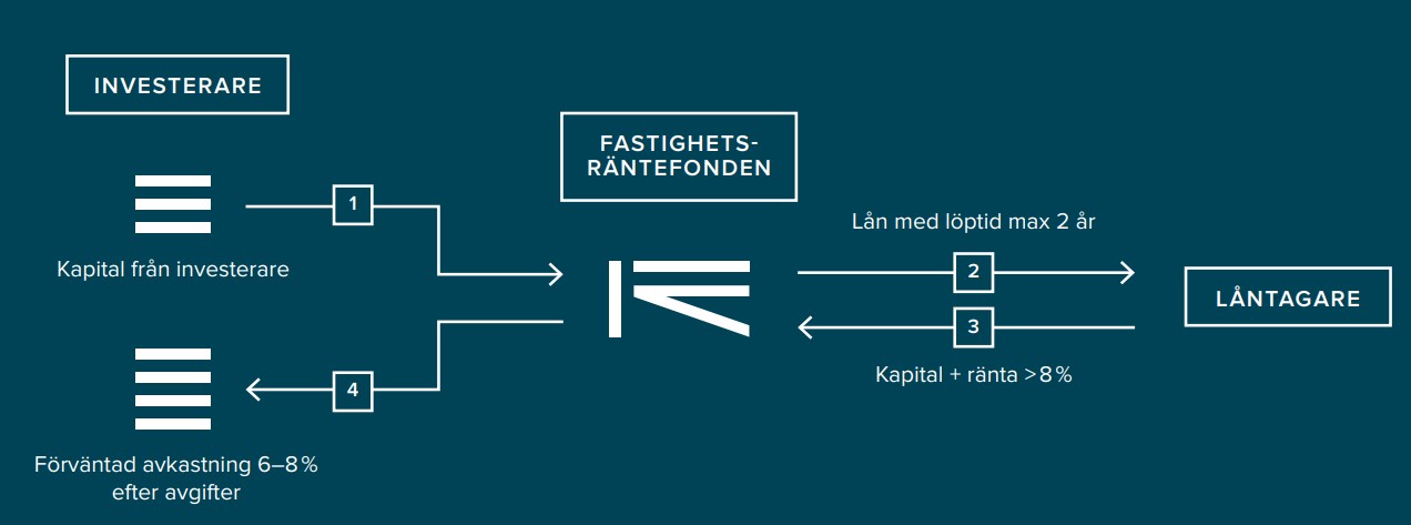 - Fastigheräntenfonden – Är en kreditfond. Istället för fysiska fastigheter eller aktieägande, får du genom fastighetsräntfonden exponering mot fastighetsmarknaden i form av säkerställda lån.
