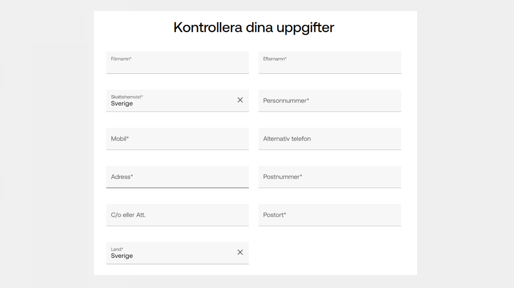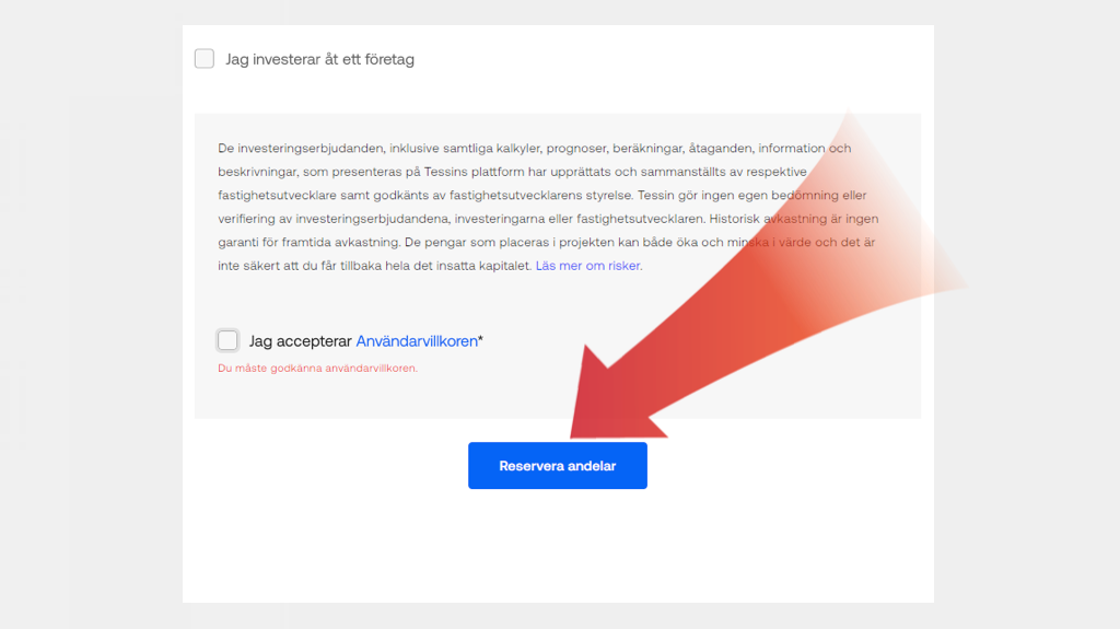Slutför din investering genom att fylla i dina personliga uppgifter. Fyll i att du accepterar användarvillkoren och klicka därefter på “Reservera andelar” →