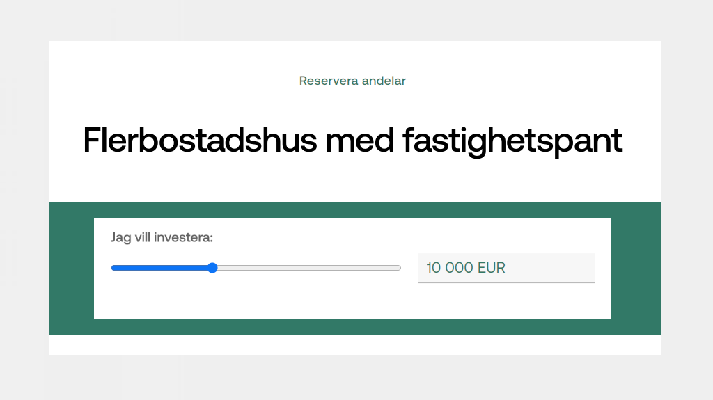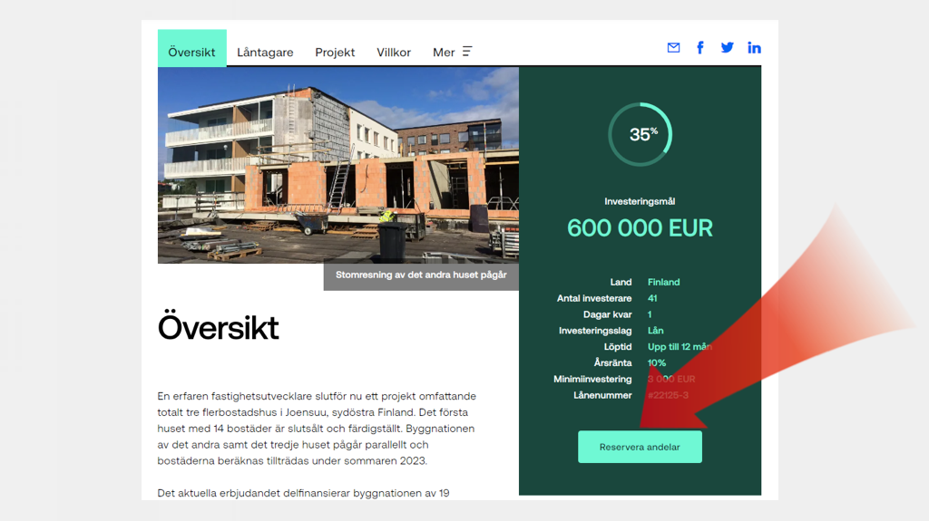 I detta steg får du en överblick om det pågående projektet. Om du känner dig bekväm med projektet går du vidare genom att klicka på “Reservera andelar”. Välj sedan för hur mycket du vill investera. I detta exempel väljer vi att investera för 10 000 EUR →