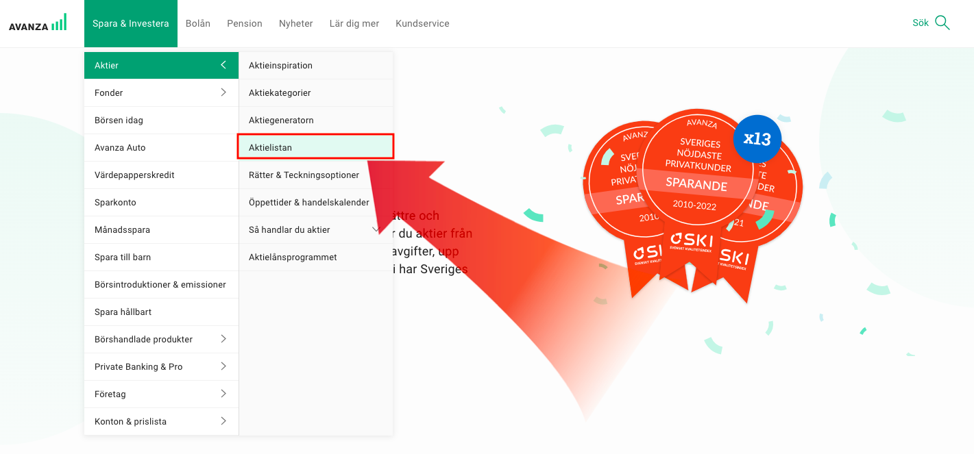 I detta steg är det dags att gå till Avanzas beQuoted-lista. För att ta dig till listan klickar du på “Spara & investera” till höger uppe i menyfältet. Välj därefter “Aktier” och sedan “Aktielistan”.