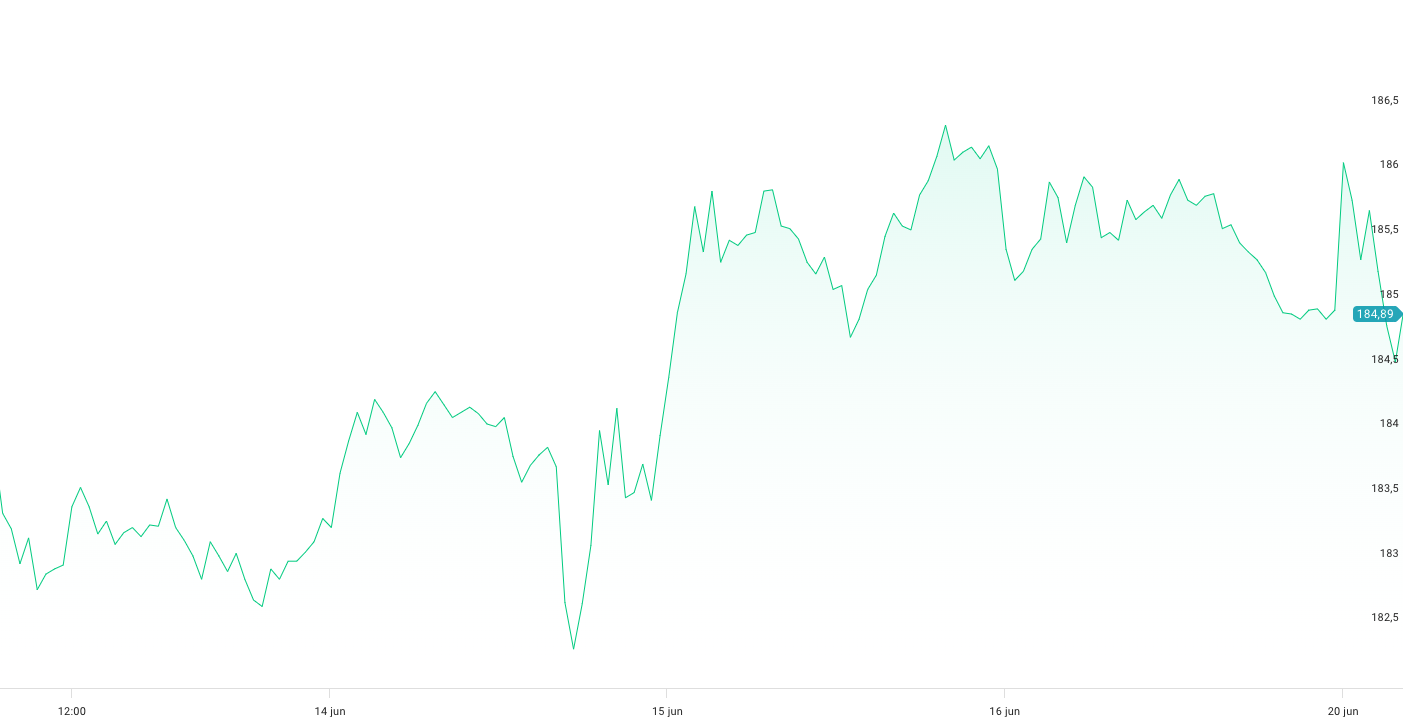 Exempel: Bilden nedan visar prisutvecklingen för Apple (AAPL) under en vecka. Vi kan se att det hela tiden genomförs köp- och säljordrar. Apples aktie har med andra ord en hög likviditet, låg spread och det är enkelt att följa dess prisutveckling.