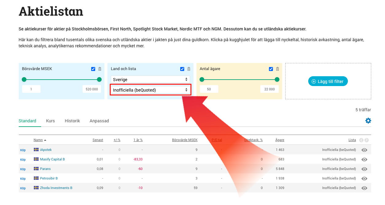 Väl inne på aktielistan klickar du på “Land och lista” och väljer Sverige. Därefter kan du välja vilken handelsplats du vill handla aktier på. Välj “Inofficiella (beQuoted)” →