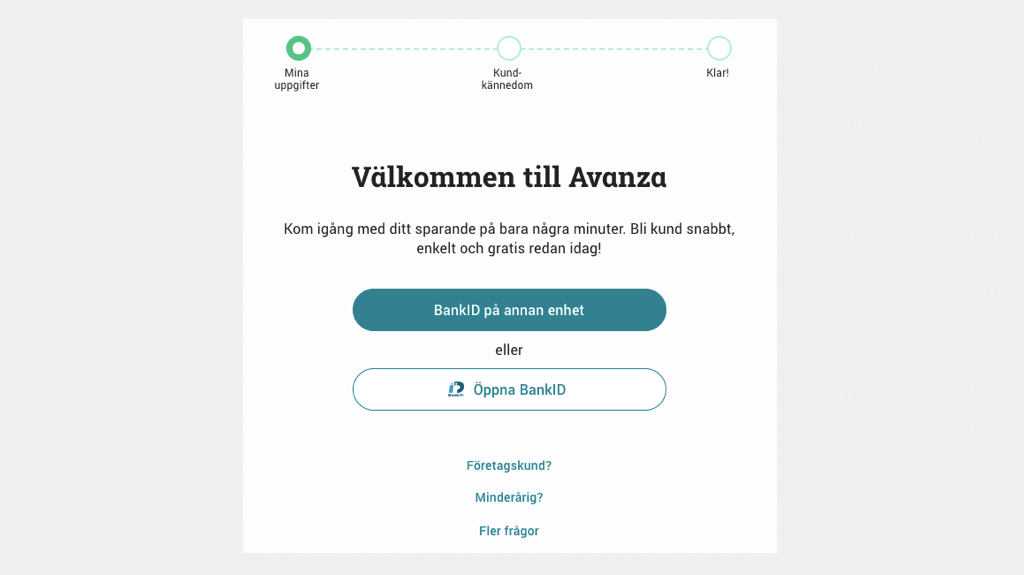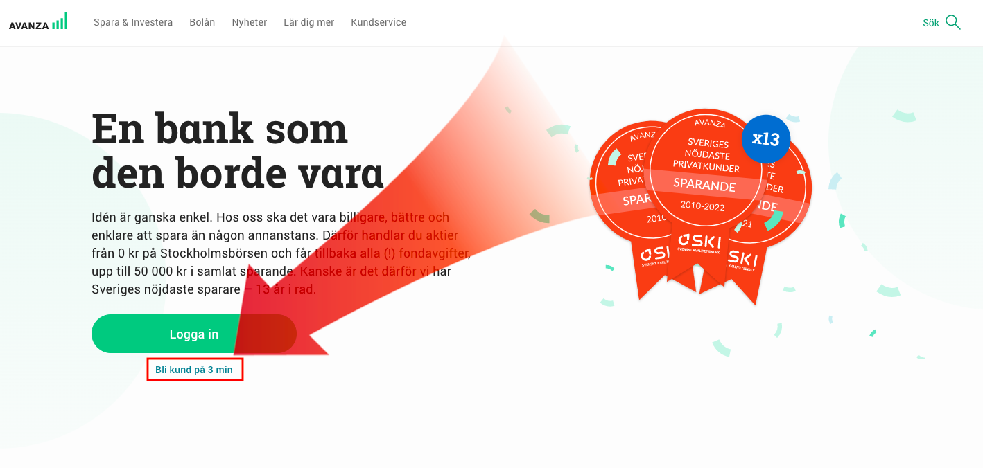 Börja med att gå till Avanzas startsida för att öppna ett konto. Följ den här länken och klicka på knappen ”Bli kund på 3 min” →