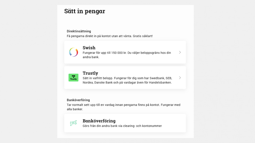 Efter att ha skapat ditt konto måste du sätta in pengar på ditt handelskonto. Enklast är att göra insättningar via Swish eller Trustly. Det tar endast ett fåtal sekunder →