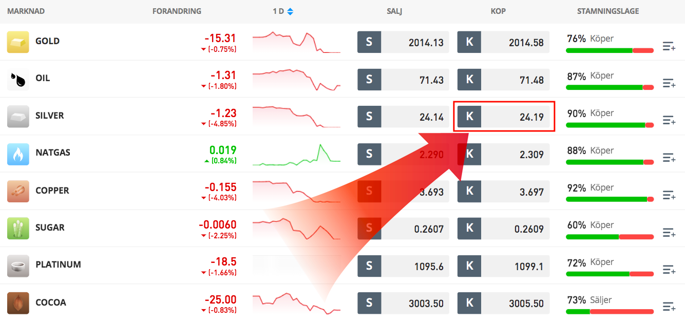 - Spekulera I prisupp- och nedgång – CFD-handel är flexibelt i den form att du kan tjäna pengar i både positiv och negativ kursutveckling. Om du alltså tror att silverpriset kommer att öka kan du öppna en köpposition. Om du tror att det istället kommer sjunka kan du öppna en säljposition.