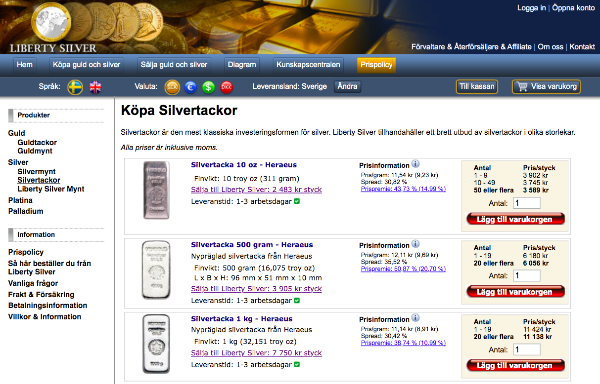 Det enklaste alternativet är att vända sig till en svensk aktör, såsom LibertySilver, Guldcentralen och NSG. Fördelen med att vända sig till en svensk aktör är att du kan få hjälp via svensk kundservice för frågor kring ditt köp. Bilden nedan visar exempel på silvertackor du kan köpa hos LibertySilver.