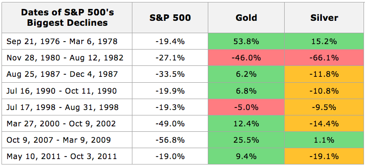 Bilden nedan visar att både guld och silver fungerar som bra komplement till börsen. De bidrar båda till en mer riskjusterad avkastning i tider av oroliga börsklimat. Dock kan guld dock ses som något vassare än silver.