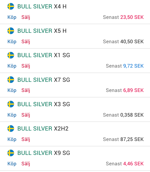 Hos Avanza kan du exempelvis handla både bull och bear certifikat med hävstång från 1 till och med 9. Det ger dig chansen till att kunna tjäna lika mycket i avkastning som silverpriset rör sig, eller betydligt mer på endast små kursförändringar (se lista från Avanza på silver bull-certifikat nedan).