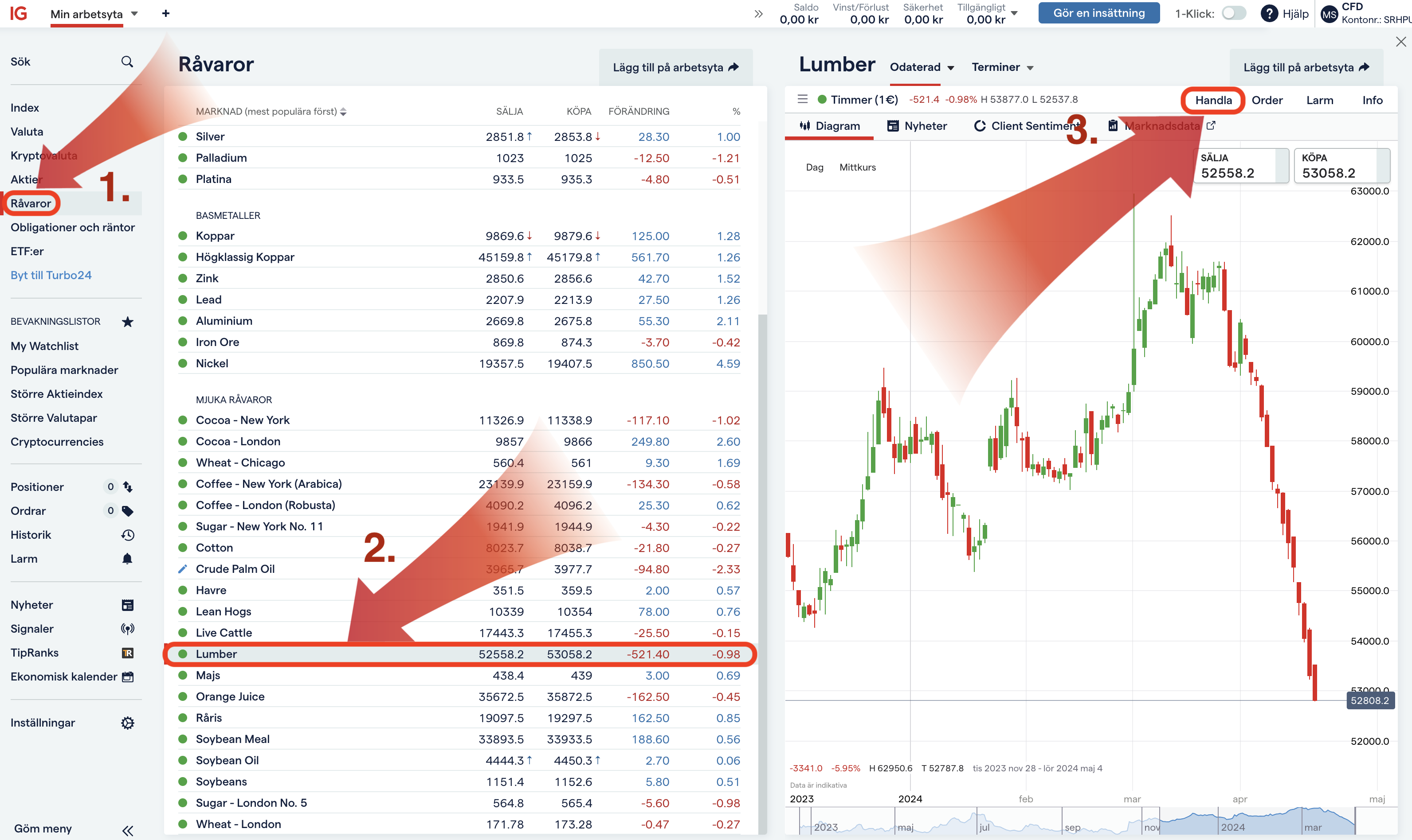- Investera i timmer via CFD – Om man inte direkt vill äga skogen kan man handla CFD-kontrakt som ger en exponering mot timmerpriset. Det handlas enklast hos IG Markets.