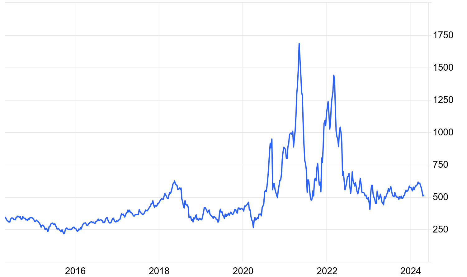I grafen nedan visas prisutvecklingen för timmer i amerikanska dollar, mellan 2014 och 2024. Priset mäts i kontrakt för 1 000 m3fub, vilket är ett mått på volym för timmer utan bark.