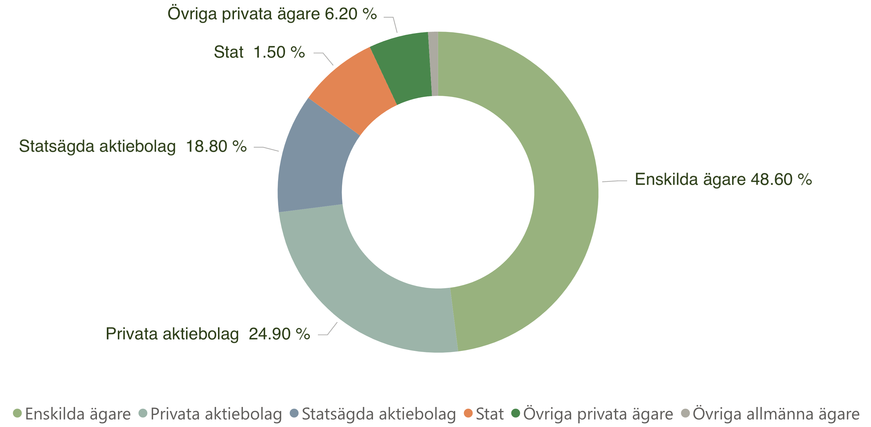 I Sverige ägs 48.60 % av all skogsmark av enskilda skogsägare. Det vill säga nästan hälften av all skogsmark i landet. Det totala antalet ägare uppgick då till drygt 310 000. Fördelningen bland ägare i Sverige såg ut enligt följande.
