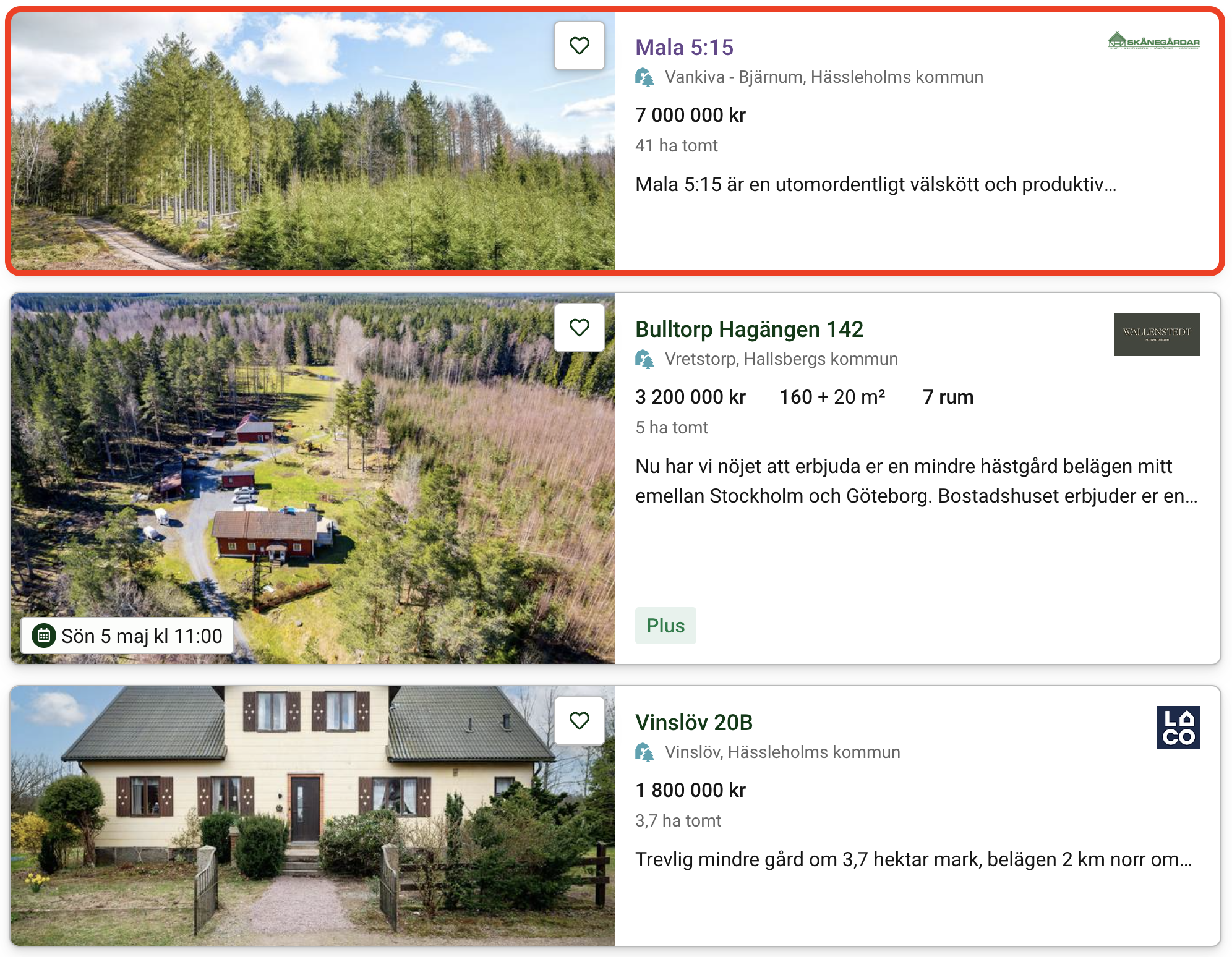 Väl inne på deras webbplats filtrerar du på skogsfastigheter genom att välja “gårdar/skogar”. Du kan enkelt välja i vilket område du söker en skogsfastighet till salu samt övriga sökfilter som lägst och högst pris.