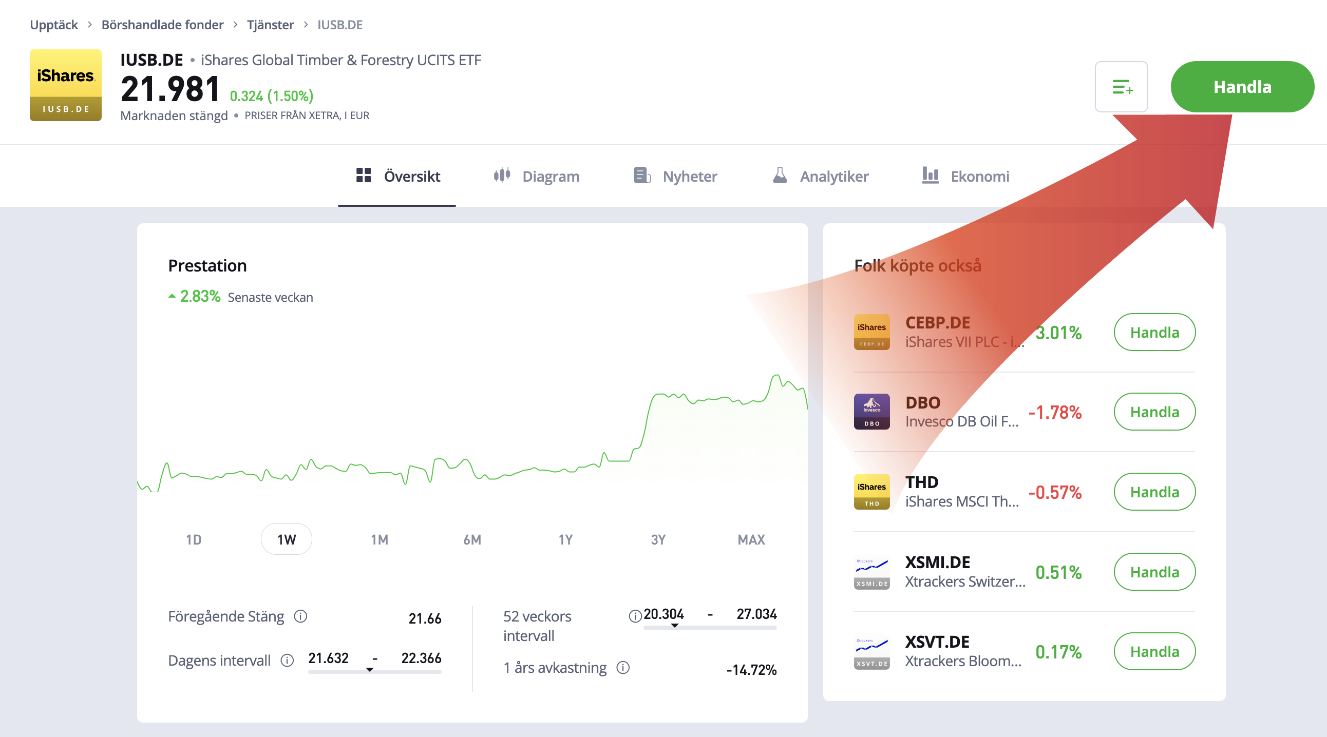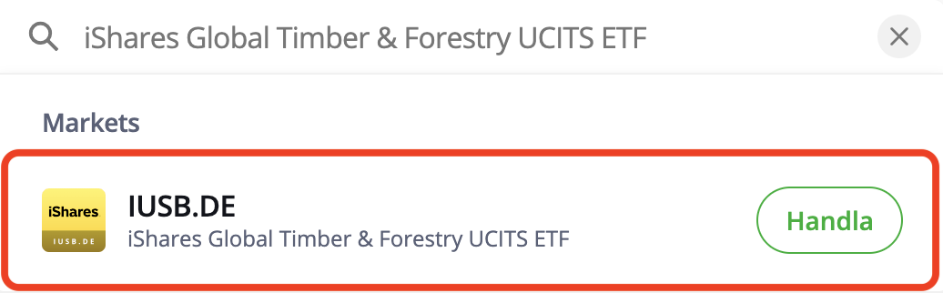 När du fört över pengar till ditt konto kan du välja en investering. I detta exempel väljer vi ”iShares Global Timber & Forestry UCITS ETF” och klickar sedan på “Handla”.