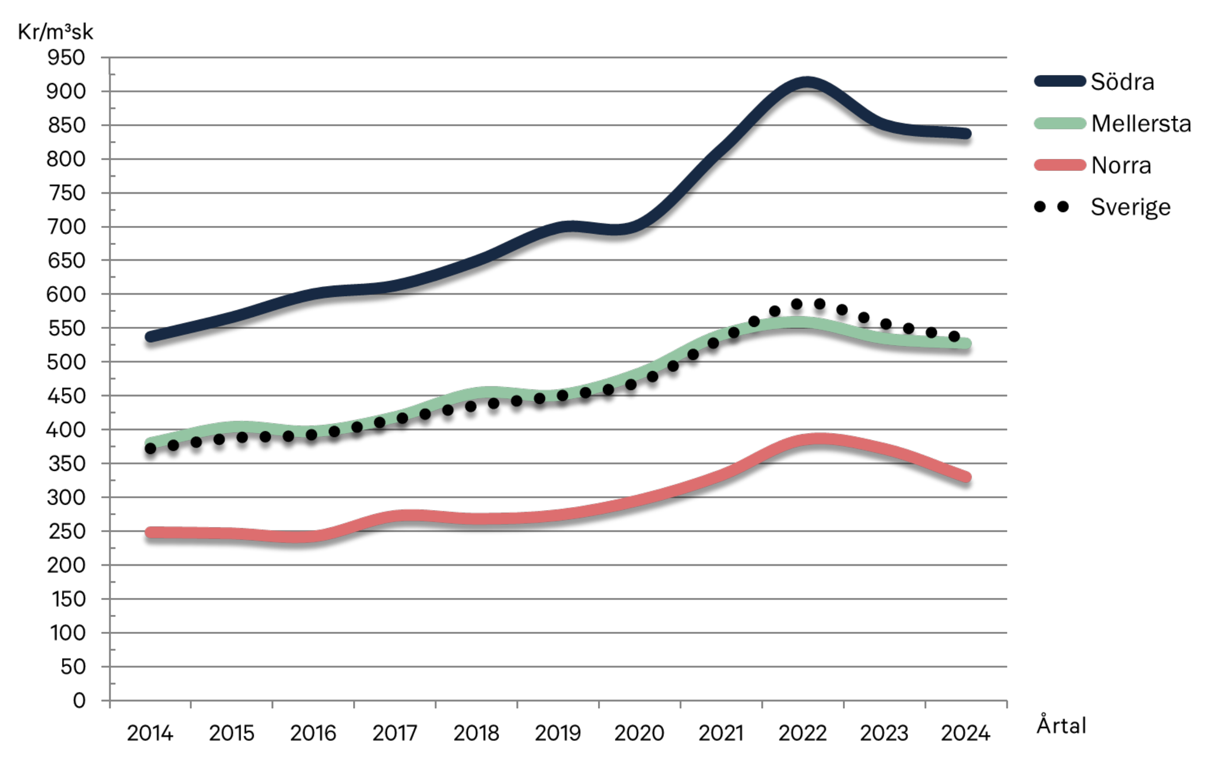Grafen nedan visar hur skogspriset förändrats under en 10-årsperiod. Den lodräta axeln (Y-axeln) speglar priset i kubikmeter. Den vågräta axeln (X-axeln) visar på tiden från 2014 till 2024.