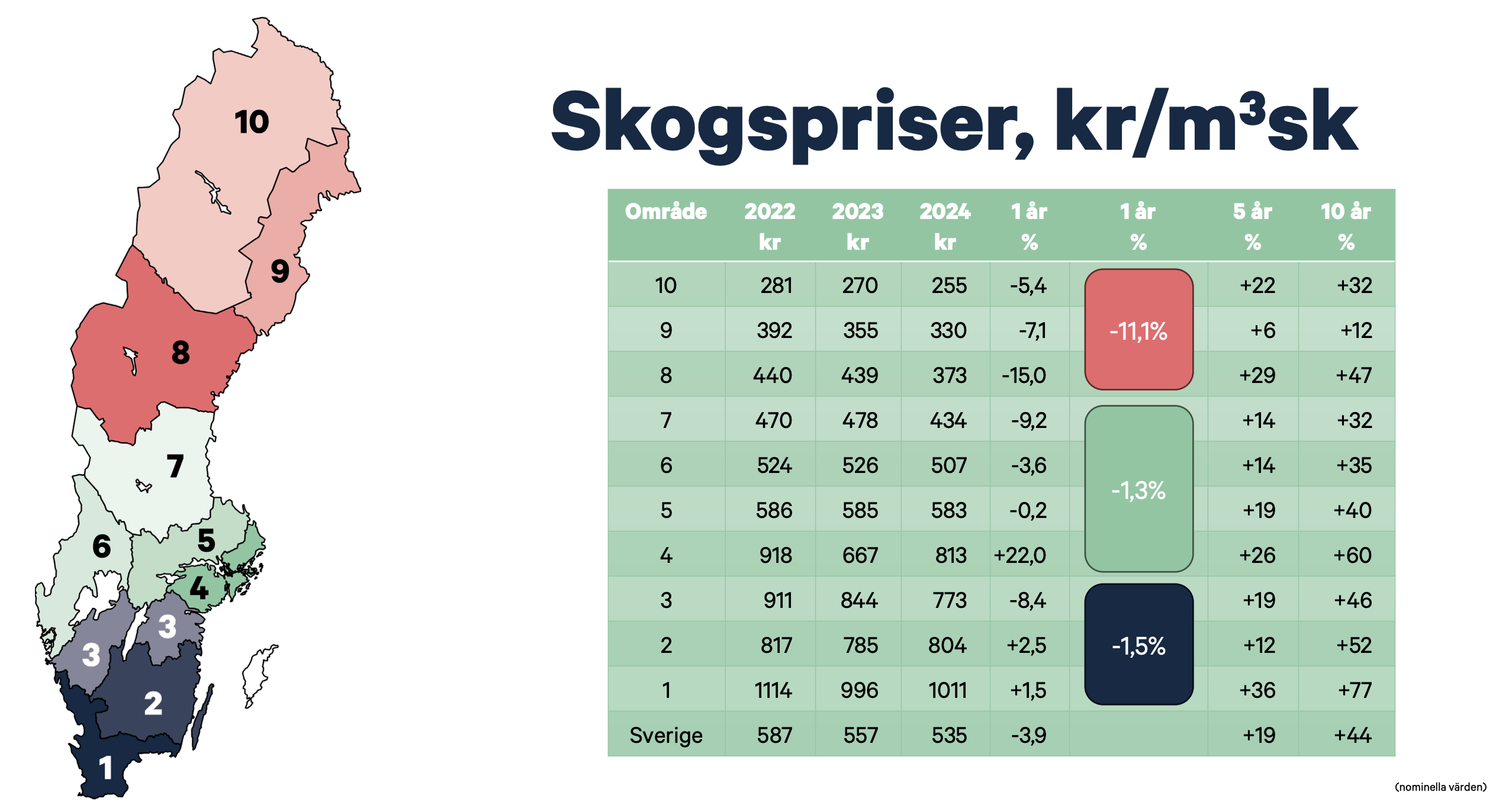 Nedan kan du jämföra prisutvecklingen för skogsfastigheter, i samtliga län i Sverige, för helåren 2022, 2023 och 2024. Vidare ges den procentuella prisförändringen under 1 år, 5 år och 10 år. Vad som går att se utifrån bilden är att det finns stora regionala skillnader i skogspriserna.