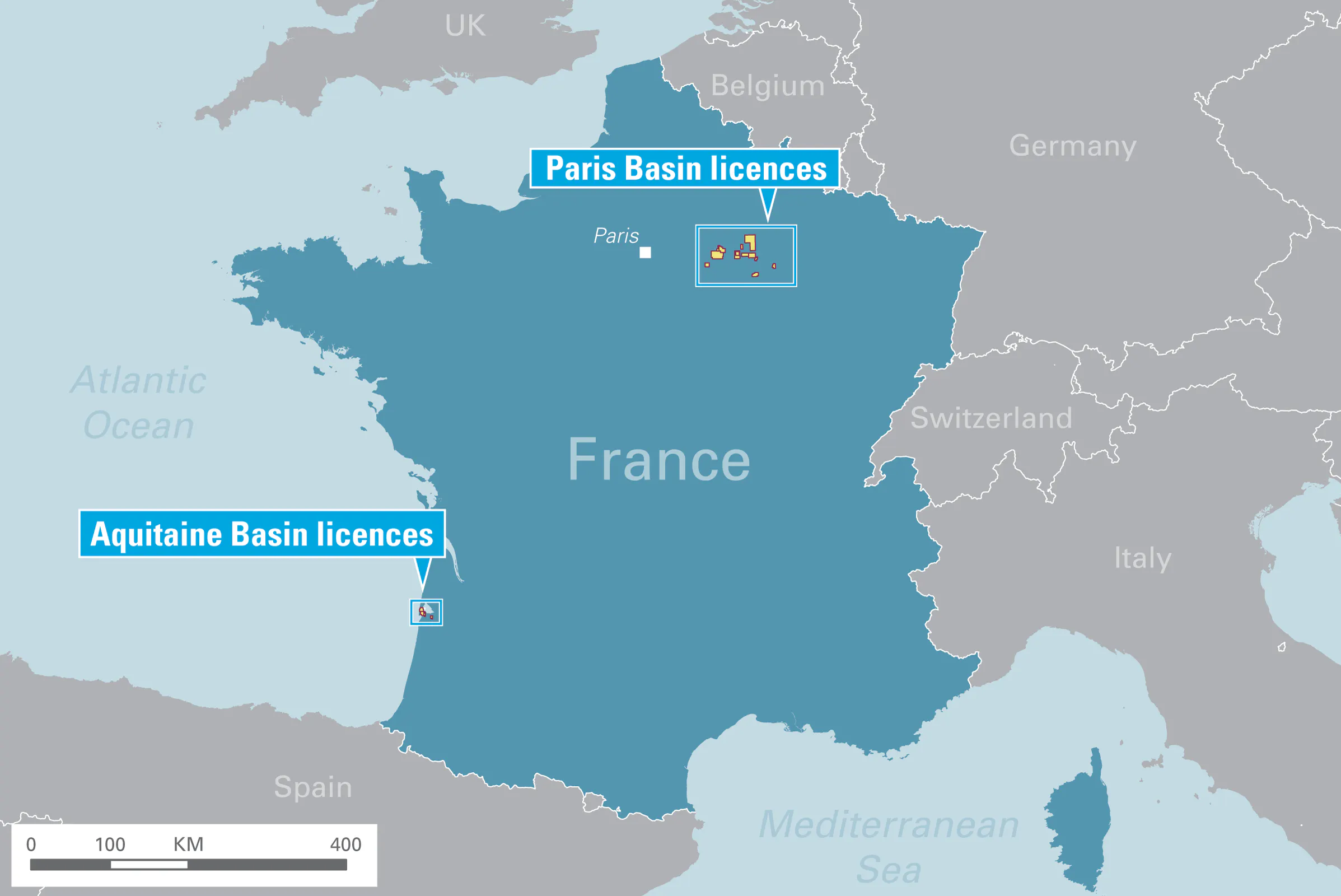 - Områden där man äger tillgångar: Paris- och Aquitaine-bäckenet