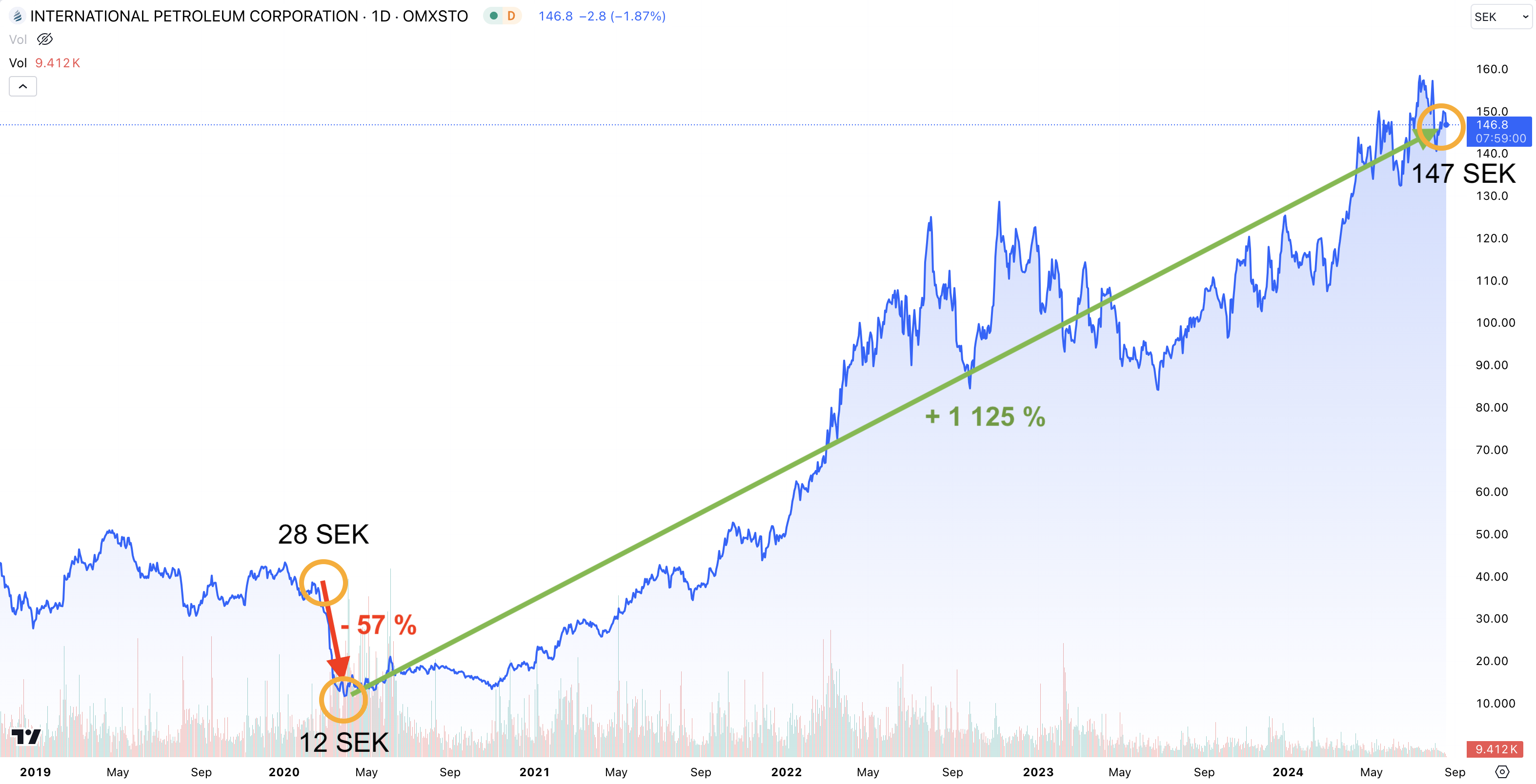 Aktien utvecklades mycket positivt mellan 2020 och 2022 som en effekt av att oljepriset steg kraftigt. Efterfrågan på olja återgick nämligen till de normala nivåerna när våra samhällen öppnas upp igen efter att ha legat nedstängda under en längre tid på grund av Covid-19 pandemin.