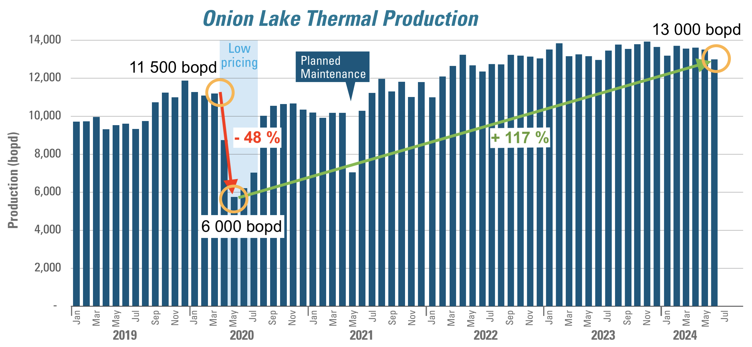 Sedan oljepriset återhämtat sig har oljeproduktionen stigit kraftigt från låga 6 000 fat till 13 000 fat per dag. Det är en ökning med cirka 117 %.