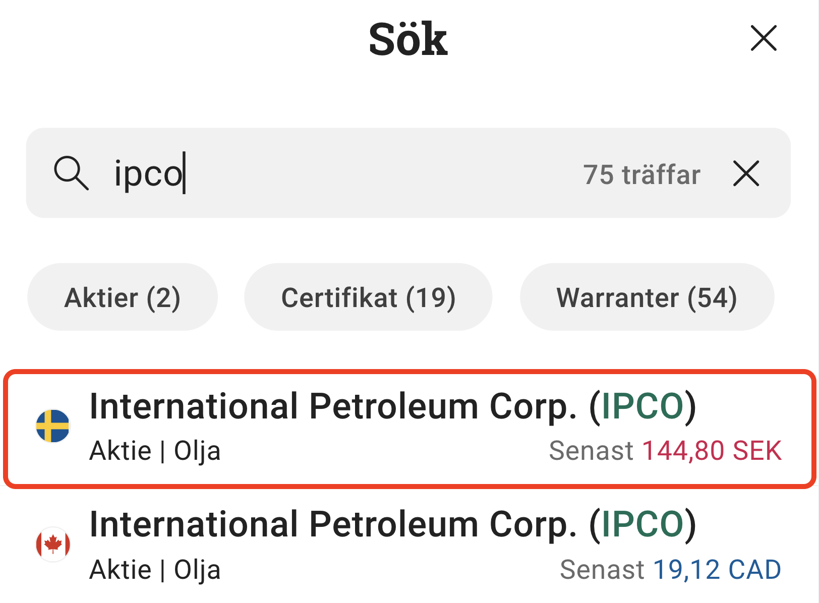 Har du pengar på ditt konto? Då klickar vi på sökknappen, söker och väljer IPCO. Notera att International Petroleum Corporation finns både noterad på den svenska och kanadensiska börsen. I detta exempel väljer vi att investera i dess aktier på den svenska börsen prissatta i svenska kronor (SEK).