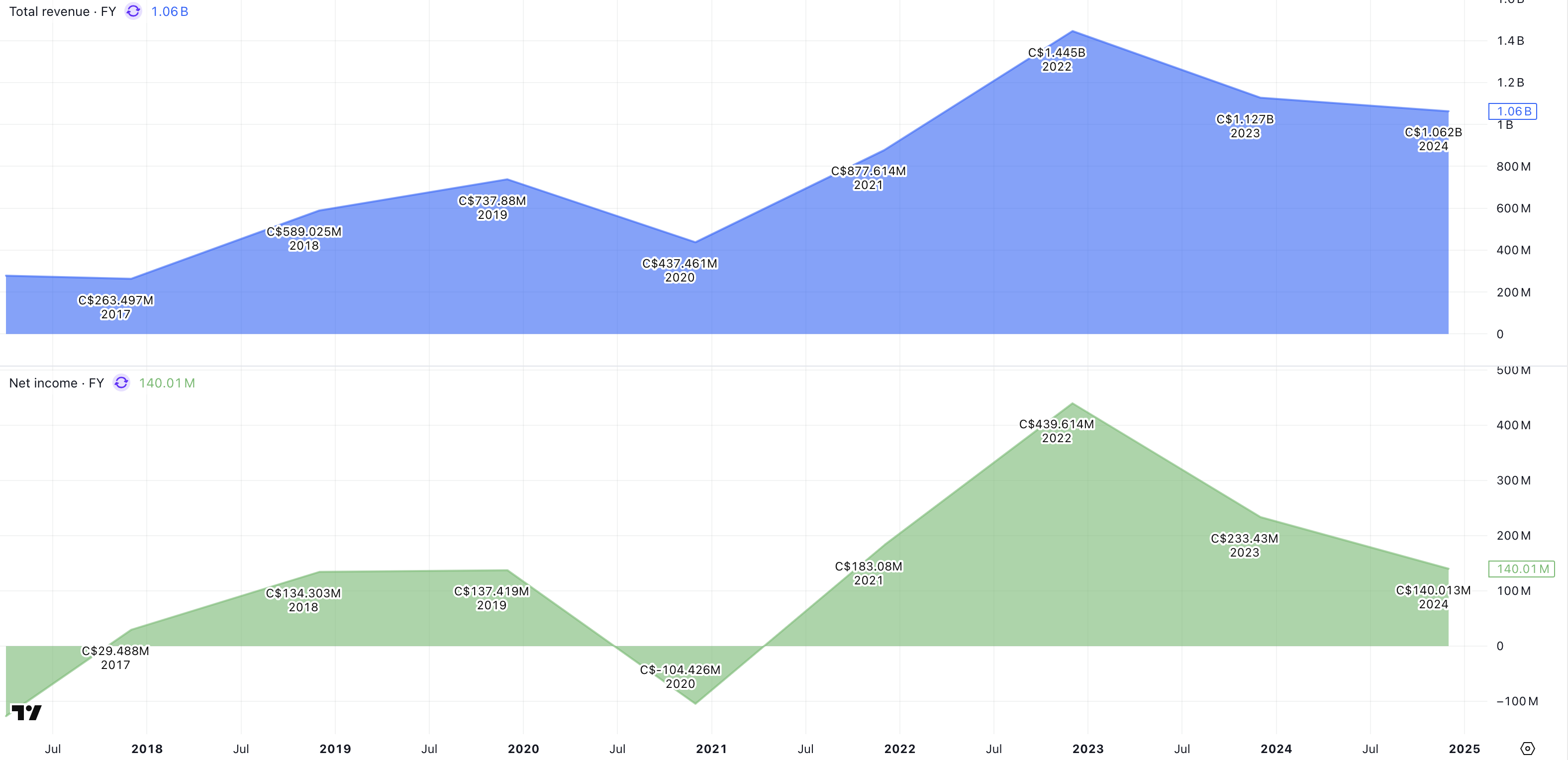 Omsättningen uppgick till 263 miljoner CAD år 2017. Den uppgick istället till 1 062 miljoner CAD år 2024. Intäkterna har alltså stigit med cirka 303 % under denna 7-årsperiod. Det är lika med ackumulerad genomsnittlig omsättningstillväxt på cirka 22 % per år.
