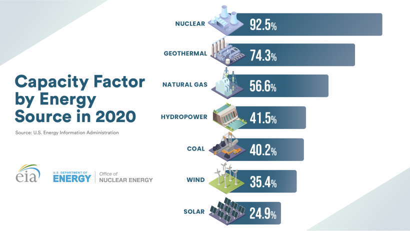 Kärnkraftverk producerar en maximal effekt på mer än 92 % av tiden under ett år. Kärnkraft producerar alltså nästan dubbelt så mycket energi som naturgas och nästan tre gånger så mycket som förnybara energikällor.