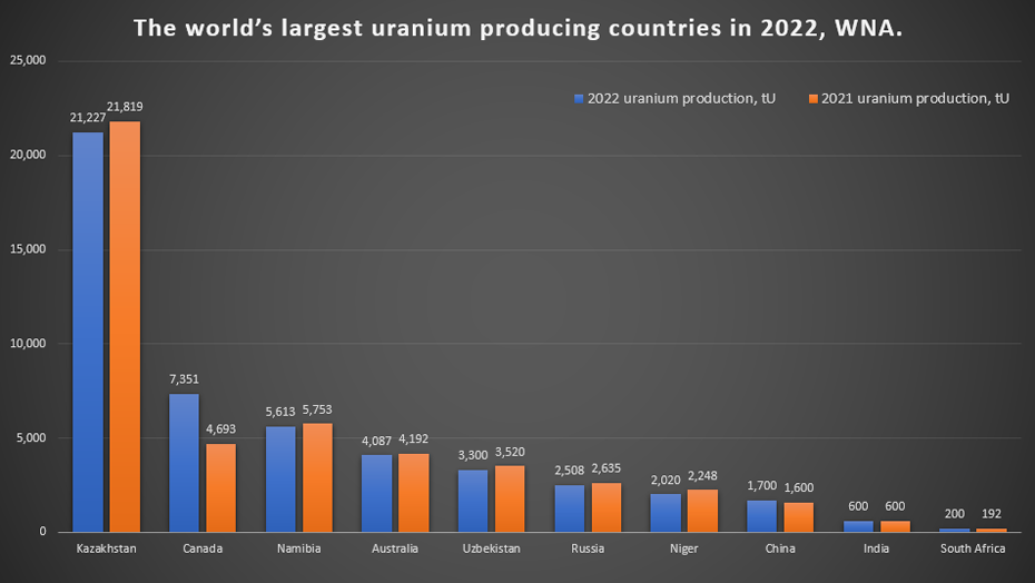 Ännu en risk med kärnkraft är att produktionen av uran endast är koncentrerad till ett fåtal länder. Den enskilt största uranproducenten är Kazakstan som står för mer än 40 % av den globala produktionen. Därefter följer i tur och ordning Kanada, Australien, Namibia och Niger.